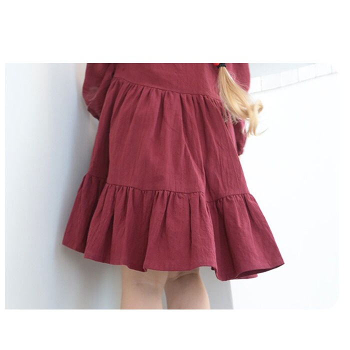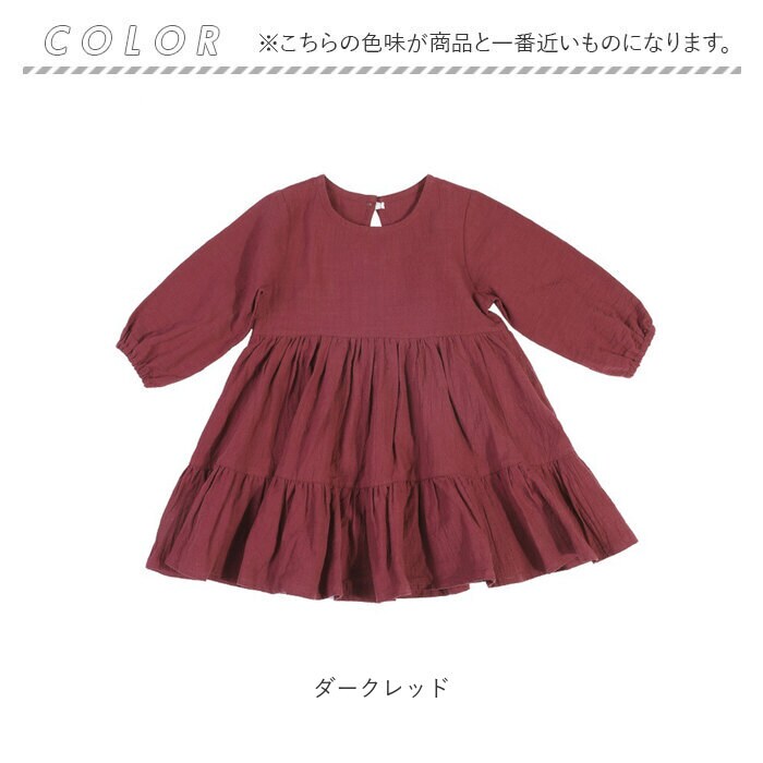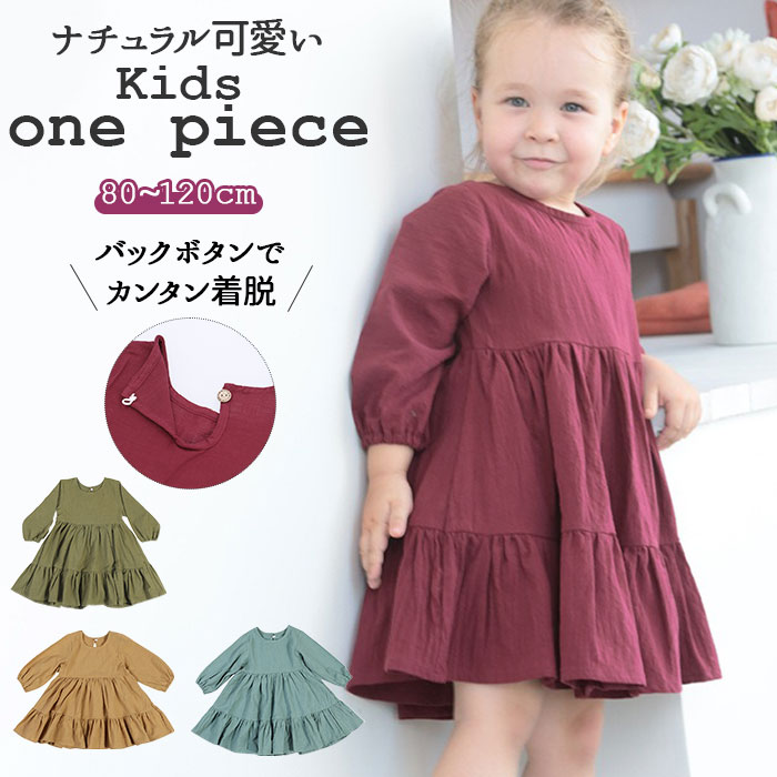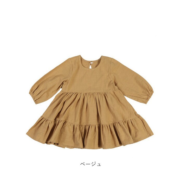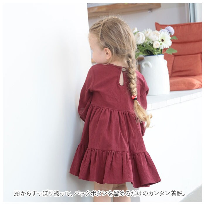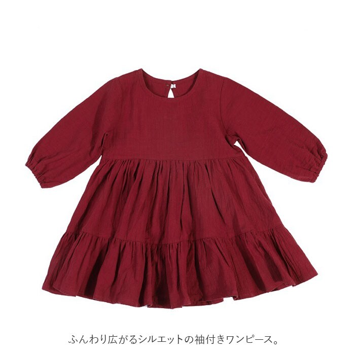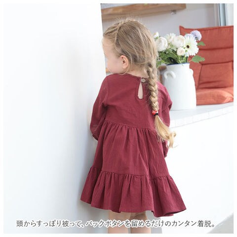 | 商品説明 | ナチュラル可愛い、キッズ用のワンピース♪サラッとした生地感で、軽い着心地◎袖口にギャザー入りで、腕まくりもラクチン。頭からすっぽり被って、バックボタンを留めるだけのカンタン着脱。ふんわり広がるシルエットの袖付きワンピース。春や秋はもちろん、冬はお手持ちのカーディガンなどを羽織れば、ロングシーズン活躍! |