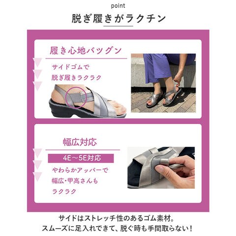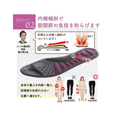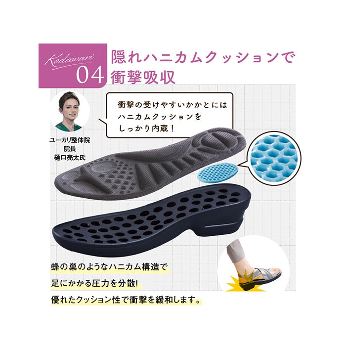 | 商品説明 | 身体の悩みに寄り添うアイテム。「KOSHIRAKU 美脚サンダル」が新登場。【こだわりのインソール】外側縦アーチ、横アーチ、土踏まずの内側縦アーチを搭載した3Dアーチ設計。足のクッション機能をアシスト、衝撃を吸収するハニカムクッションも内蔵。【安定した歩行をサポート】母趾球に重心を置くことで足指の位置を正しくサポートし、腰への負担を軽減。股関節にかかる負担が少ない位置へ導く、内側誘導形状。【脱ぎ履きがラクチン】サイドはストレッチ性のあるゴム素材。スムーズに足入れできて、脱ぐ時も手間取らない!【滑りにくく安心】底面は凹凸を施し、滑りにくいラバー仕様。【選べるカラー】年代問わず履きやすい、落ち着きのあるカラー展開。オフィスサンダルとしてもおすすめ。 |