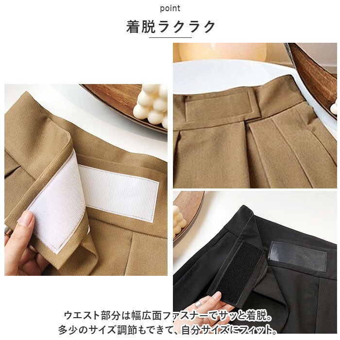 | 商品説明 | おしゃれにキマる♪使い勝手ばっちりなタックワイドパンツが新登場。【タック入りの絶妙なワイドシルエット】大きめにタックを入れることで、ウエストや腰回りにゆとりをプラス。全体的にワイドデザインなので、体のラインを拾いにくく気になる部分もカバー◎【着脱ラクラク】ウエスト部分は幅広面ファスナーでサッと着脱。多少のサイズ調節もできて、自分サイズにフィット。【ハイウエストデザイン】ダボッと見えすぎず、ウエストすっきり!スタイルアップが叶うアイテム。【便利なポケット付き】左右に配置されたポケットには、スマホや薄手のハンカチをIN。(※バックポケットはフェイクです。)【オールシーズン快適】柔らかく、サラッとムレにくい生地感。冬は薄手のタイツなどを着用すれば、シーズンレスで活躍。【着回し力バツグン】どんなトップスとも相性の良い、シンプルな無地デザイン。1本持っているだけで、いつものコーデがワンランクアップ☆ |