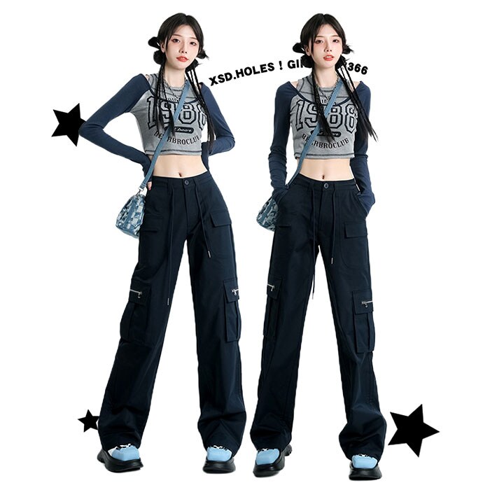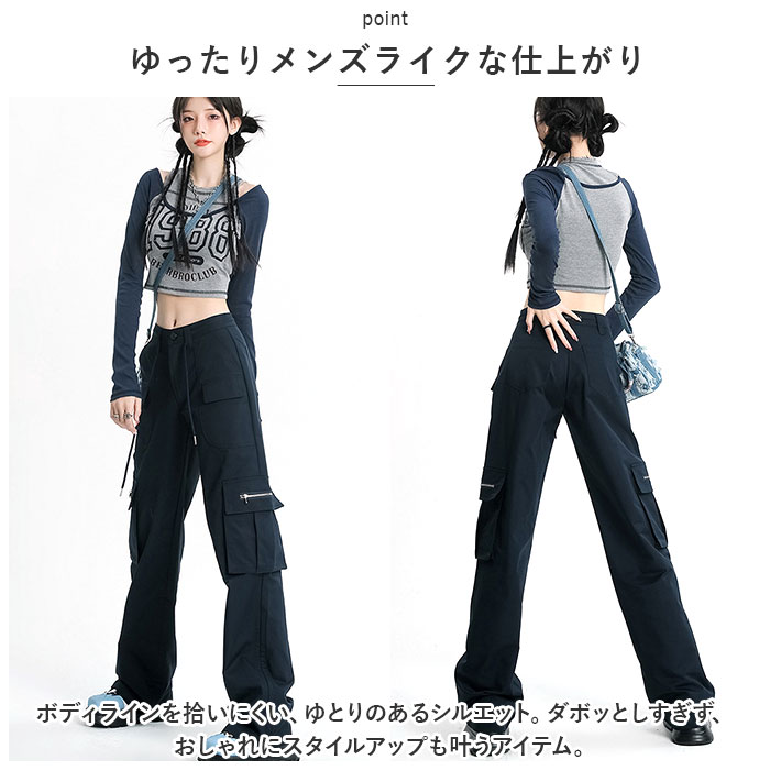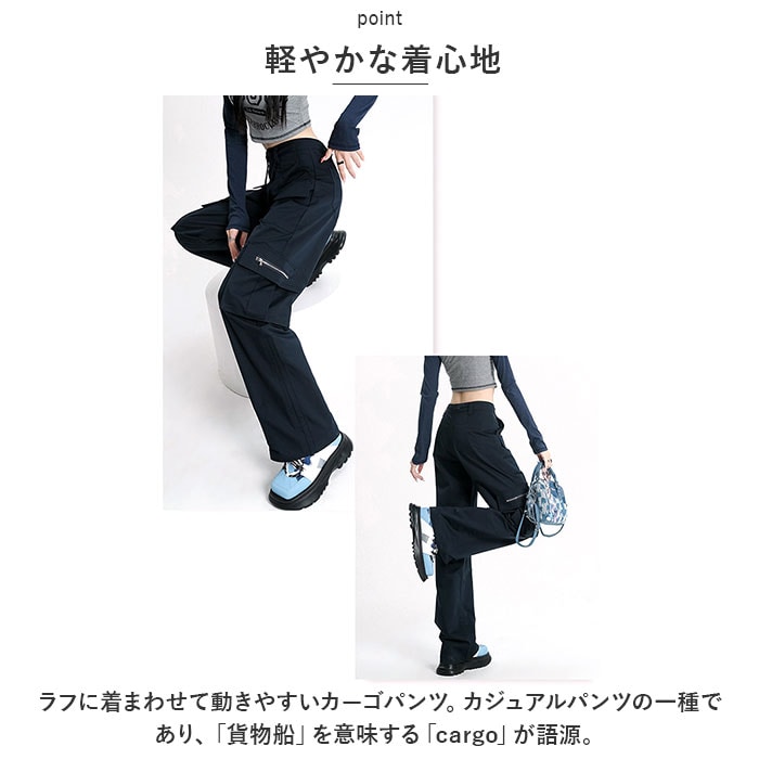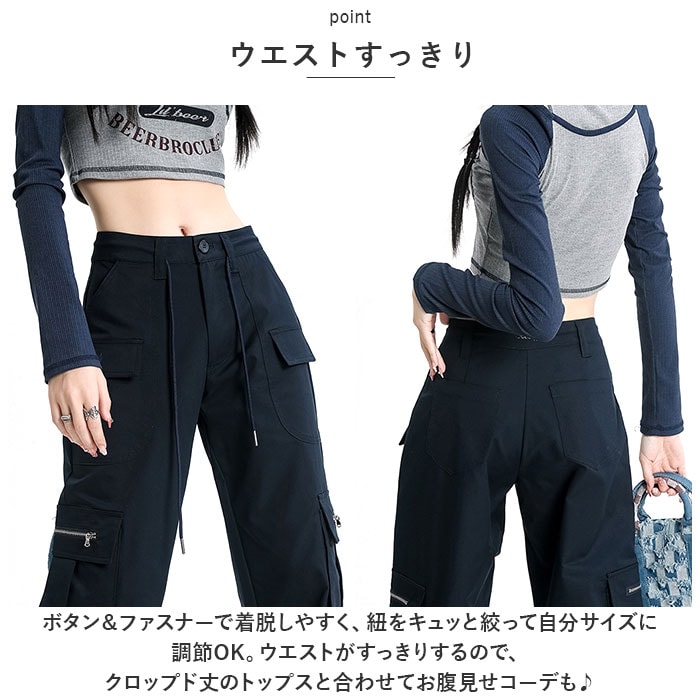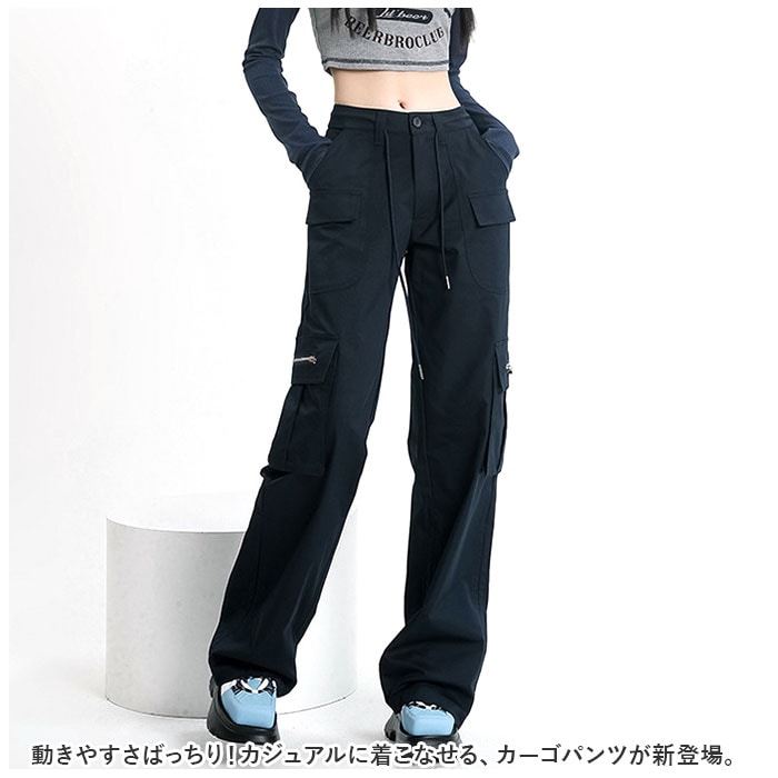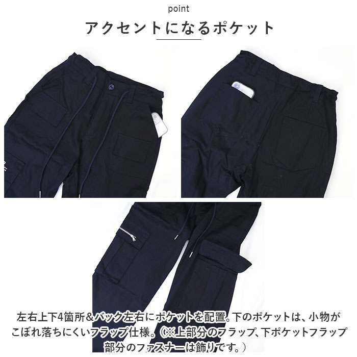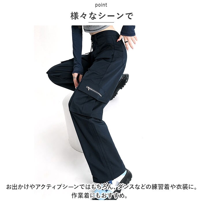 | 商品説明 | 動きやすさばっちり!カジュアルに着こなせる、カーゴパンツが新登場。【軽やかな着心地】ラフに着まわせて動きやすいカーゴパンツ。カジュアルパンツの一種であり、「貨物船」を意味する「cargo」が語源。【ゆったりメンズライクな仕上がり】ボディラインを拾いにくい、ゆとりのあるシルエット。ダボッとしすぎず、おしゃれにスタイルアップも叶うアイテム。【ウエストすっきり】ボタン&ファスナーで着脱しやすく、紐をキュッと絞って自分サイズに調節OK。ウエストがすっきりするので、クロップド丈のトップスと合わせてお腹見せコーデも♪【アクセントになるポケット】左右上下4箇所&バック左右にポケットを配置。下のポケットは、小物がこぼれ落ちにくいフラップ仕様。(※上部分のフラップ、下ポケットフラップ部分のファスナーは飾りです。)【様々なシーンで】お出かけやアクティブシーンではもちろん、ダンスなどの練習着や衣装に。作業着にもおすすめ。【長さの異なる2タイプ】丈のタイプは2種類用意しているので、お好みに合わせてチョイス!【シックなネイビーカラー】落ち着きがあり、トップスを選ばず着られるネイビーカラー。大人っぽいコーデが完成! |
