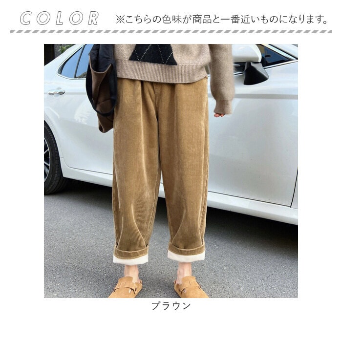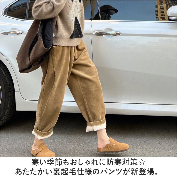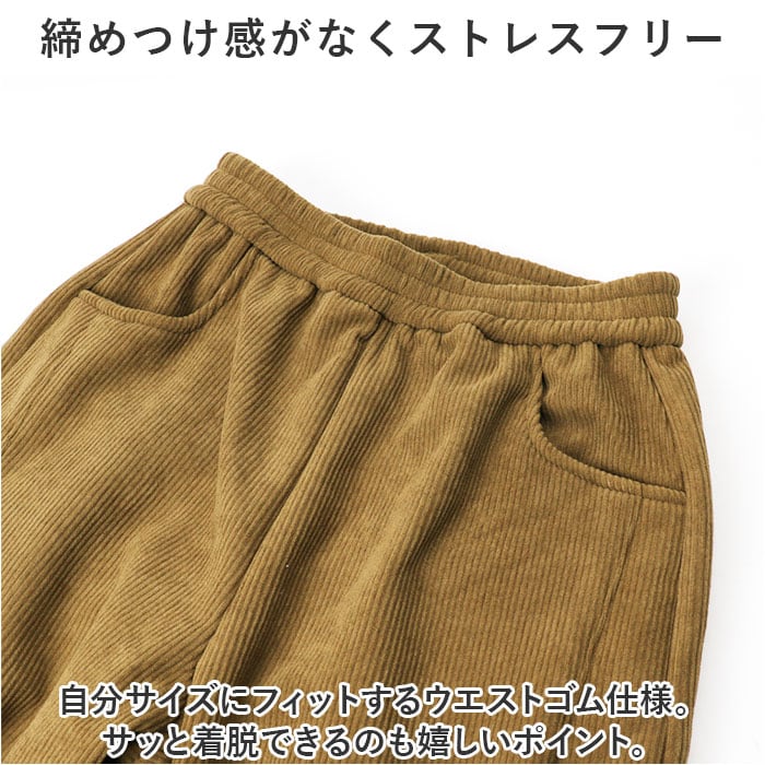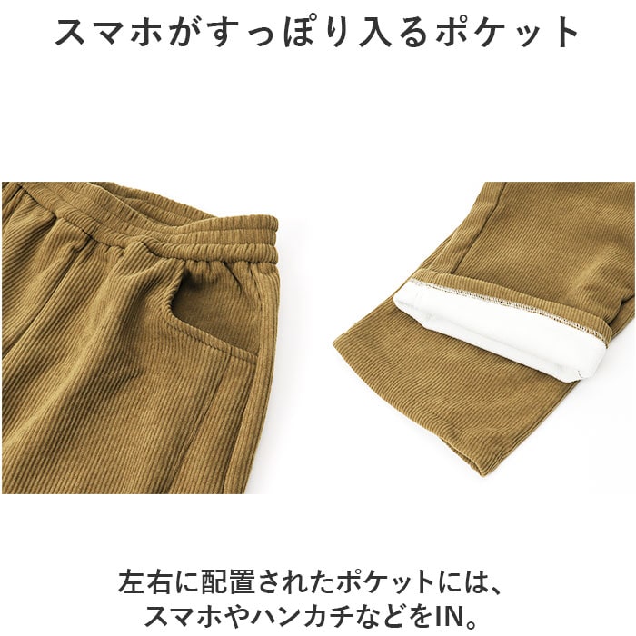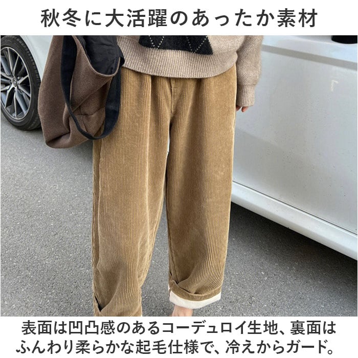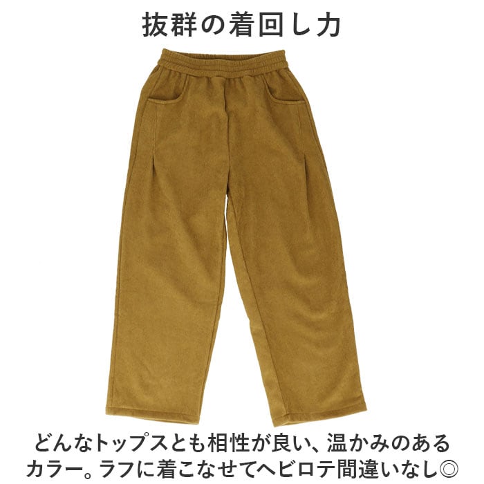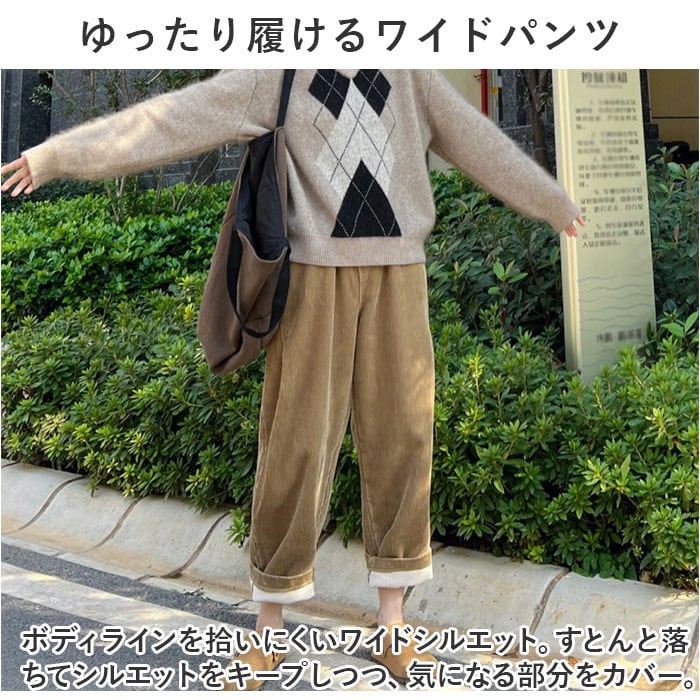 商品説明寒い季節もおしゃれに防寒対策☆あたたかい裏起毛仕様のパンツが新登場。【秋冬に大活躍のあったか素材】表面は凹凸感のあるコーデュロイ生地、裏面はふんわり柔らかな起毛仕様で、冷えからガード。【ゆったり履けるワイドパンツ】ボディラインを拾いにくいワイドシルエット。すとんと落ちてシルエットをキープしつつ、気になる部分をカバー。【締めつけ感がなくストレスフリー】自分サイズにフィットするウエストゴム仕様。サッと着脱できるのも嬉しいポイント。【スマホがすっぽり入るポケット】左右に配置されたポケットには、スマホやハンカチなどをIN。【お好みでアレンジ】そのまま履くのはもちろん!裾をロールアップしてもOK。【抜群の着回し力】どんなトップスとも相性が良い、温かみのあるカラー。ラフに着こなせてヘビロテ間違いなし◎