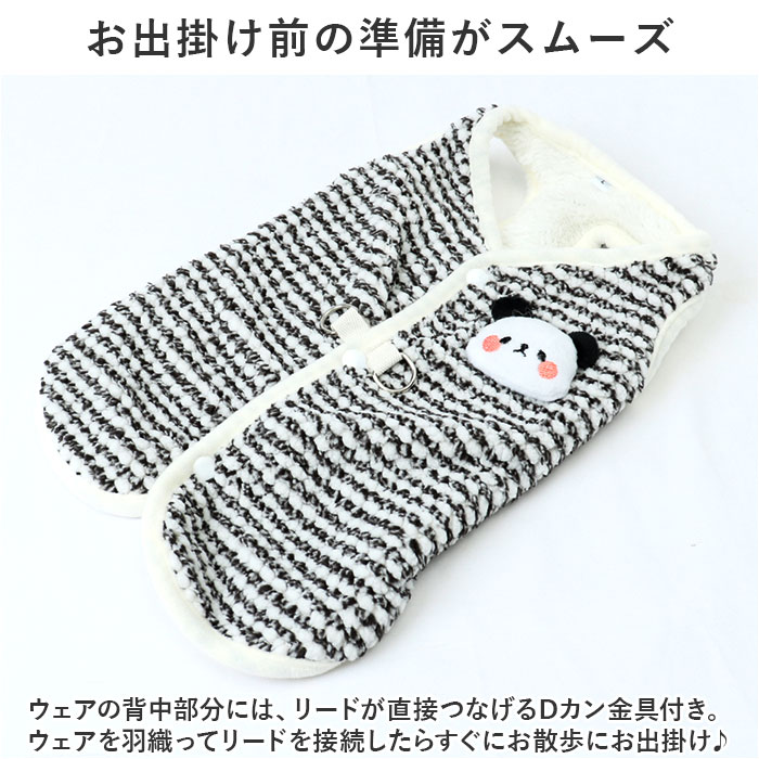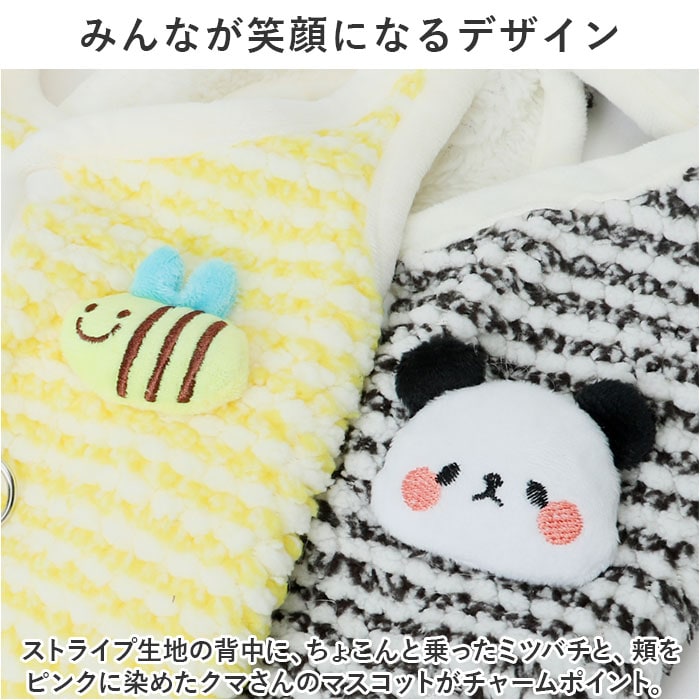 | 商品説明 | 真冬の寒い日だって、ぽかぽかベストに着替えてお散歩にGO♪背中のアニマルモチーフが可愛らしい「ペット用もこもこベスト」が新登場。【ふんわり着せて、優しく防寒】ウェアの表生地は、ぽこぽことした指触りが気持ちよいボアストライプ。ぽかぽかの着心地で、秋冬時期や春先の肌寒さの気になる季節にぴったり。【コットンボアが暖かさをキープ】ベストの裏側もふんわり柔らかなコットンボアで仕上げてあり、身体の周りの暖かな空気をしっかりとキープ。【スナップボタンで楽ちんお着替え】広げたベストの丸く輪になった部分に両前脚を通してから、生地をグッと身体に近づけるように持ち上げ、背中のスナップボタンを留めるだけで装着が簡単!【足が短めなワンちゃんにも】よちよち歩く姿が可愛い♪コーギーやフレンチブルドッグなど手足の短めなワンちゃんでもピッタリ着れるノースリーブタイプ!【お出掛け前の準備がスムーズ】ウェアの背中部分には、リードが直接つなげるDカン金具付き。首輪やハーネスを用意しなくても、ウェアを羽織ってリードを接続したらすぐにお散歩にお出掛け♪【おトイレ楽ちん・ゆったり設計】ワンちゃんがおトイレする時にもたつかない♪お腹周りやお尻が大きく開いたゆったりデザイン。【ピッタリサイズをチョイス!】XSサイズからXLサイズまでの5つのサイズから、ぴったりサイズがチョイス可能!超小型犬から、胴回り48cm程度までの中型~小型のワンちゃんに最適なサイズ感。小さなサイズはネコちゃんにも♪【みんなが笑顔になるデザイン】ストライプ生地の背中に、ちょこんと乗ったミツバチと、頬をピンクに染めたクマさんのマスコットがチャームポイント。ベストを羽織ってお散歩に出かけたら、道行く人が笑顔で振り返るほっこりデザイン。【ルームウェアにも◎】肌寒さが気になる季節のお散歩用ウェアとしてはもちろん、ルームウェアやパジャマとして、朝晩の冷え込み対策にもオススメ。 |