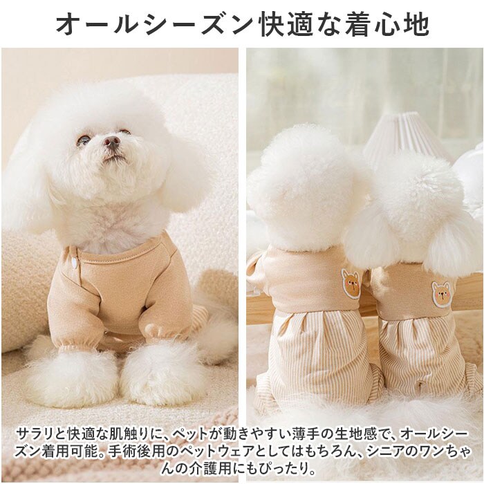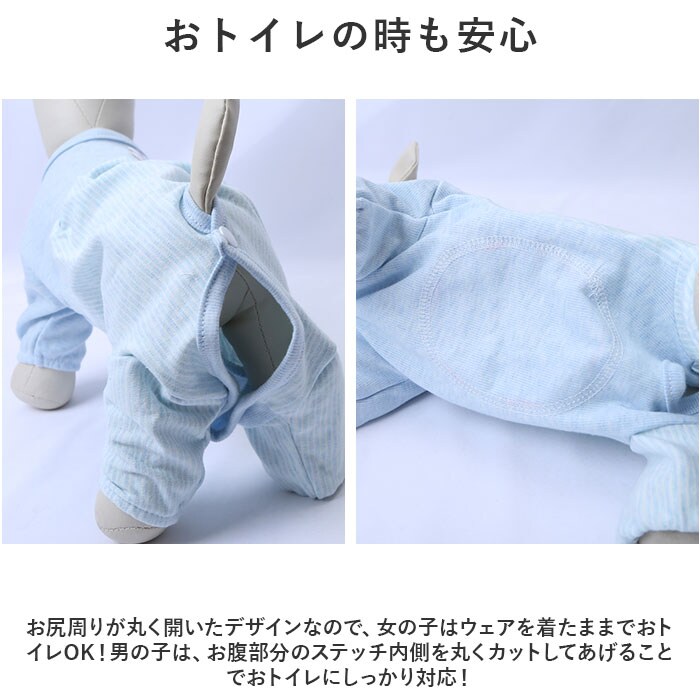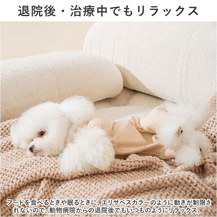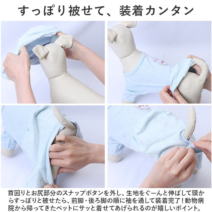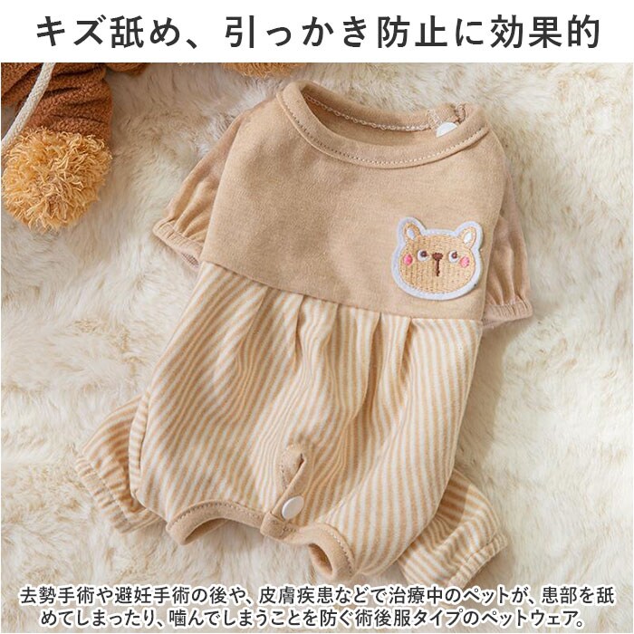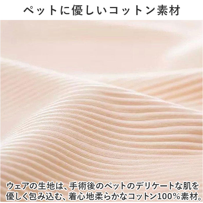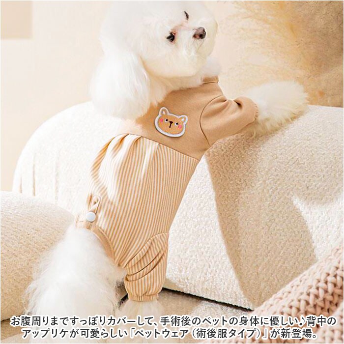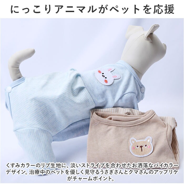 | 商品説明 | お腹周りまですっぽりカバーして、手術後のペットの身体に優しい♪背中のアップリケが可愛らしい「ペットウェア(術後服タイプ)」が新登場。【キズ舐め、引っかき防止に効果的】去勢手術や避妊手術の後や、皮膚疾患などで治療中のペットが、患部を舐めてしまったり、噛んでしまうことを防ぐ術後服タイプのペットウェア。【ペットに優しいコットン素材】ウェアの生地は、手術後のペットのデリケートな肌を優しく包み込む、着心地柔らかなコットン100%素材。【すっぽり被せて、装着カンタン】首回りとお尻部分のスナップボタンを外し、生地をぐーんと伸ばして頭からすっぽりと被せたら、前脚・後ろ脚の順に袖を通して装着完了!動物病院から帰ってきたペットにサッと着せてあげられるのが嬉しいポイント。【おトイレの時も安心】お尻周りが丸く開いたデザインなので、女の子はウェアを着たままでおトイレOK!男の子は、お腹部分のステッチ内側を丸くカットしてあげることでおトイレにしっかり対応!【退院後・治療中でもリラックス】フードを食べるときや眠るときに、エリザベスカラーのように動きが制限されないので、動物病院からの退院後でもいつものようにリラックス。【オールシーズン快適な着心地】サラリと快適な肌触りに、ペットが動きやすい薄手の生地感で、オールシーズン着用可能。手術後用のペットウェアとしてはもちろん、シニアのワンちゃんの介護用にもぴったり。【超小型犬から中型犬までカバー】XSサイズから2XLサイズまでの7つのサイズから、ぴったりサイズがチョイス可能!超小型犬から、胴回り56cm程度までの小型~中型のワンちゃんに最適なサイズ感。小さなサイズはネコちゃんにもオススメ。【にっこりアニマルがペットを応援】くすみカラーのリブ生地に、淡いストライプを合わせたお洒落なバイカラーデザイン。治療中のペットを優しく見守るうさぎさんとクマさんのアップリケがチャームポイント。 |