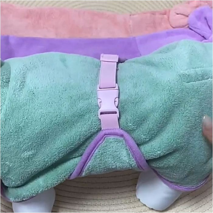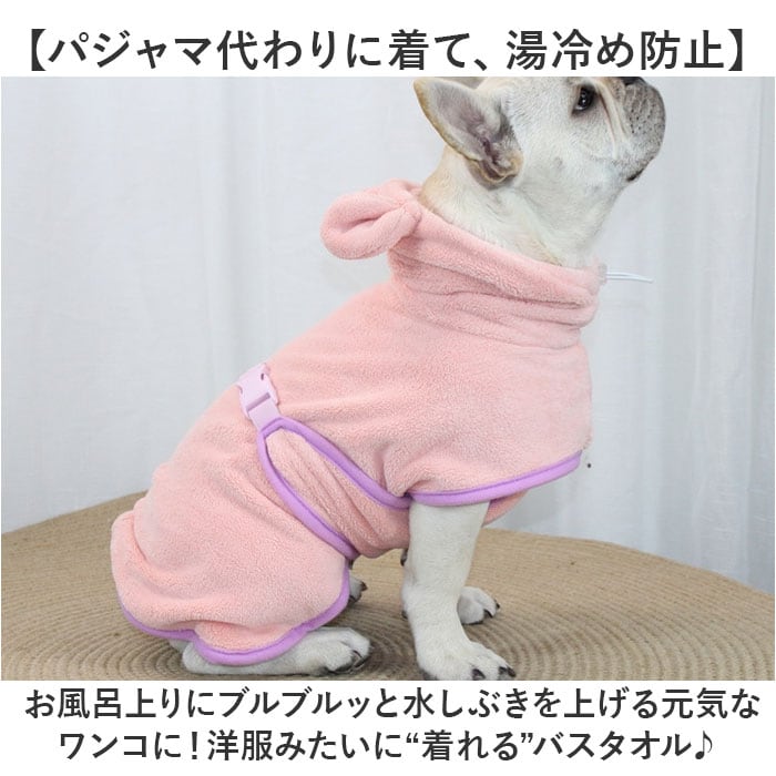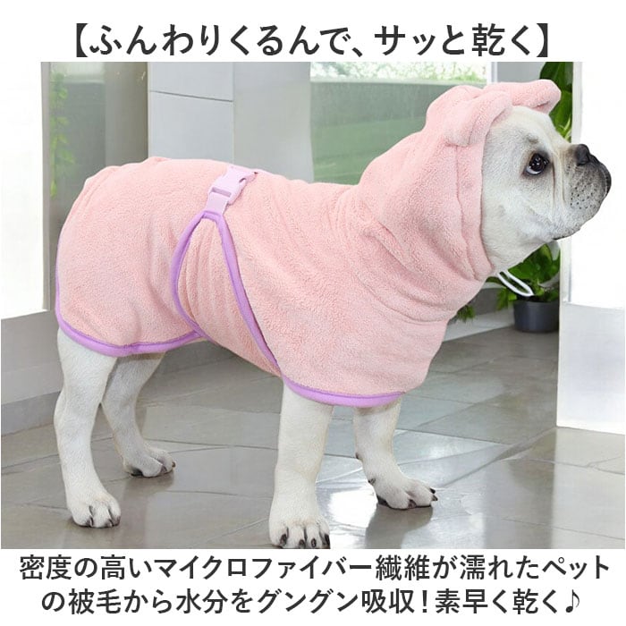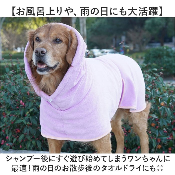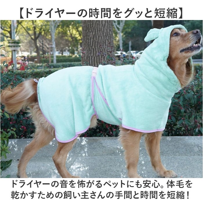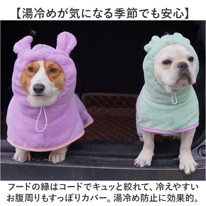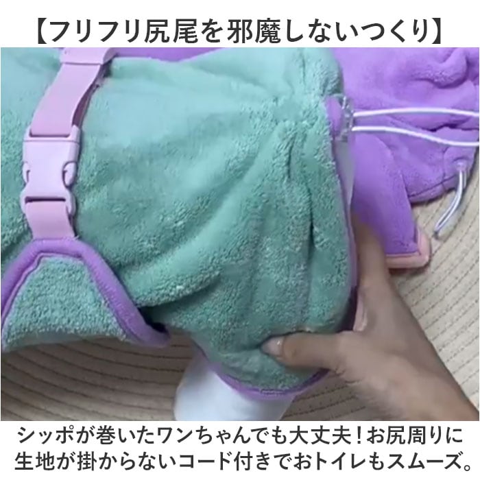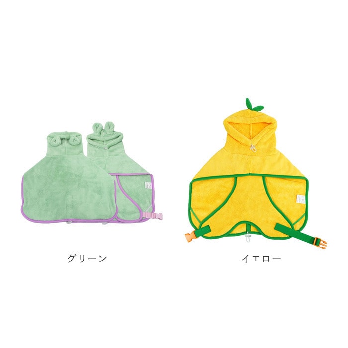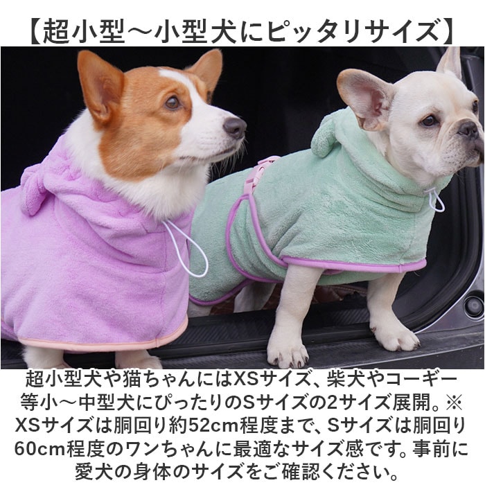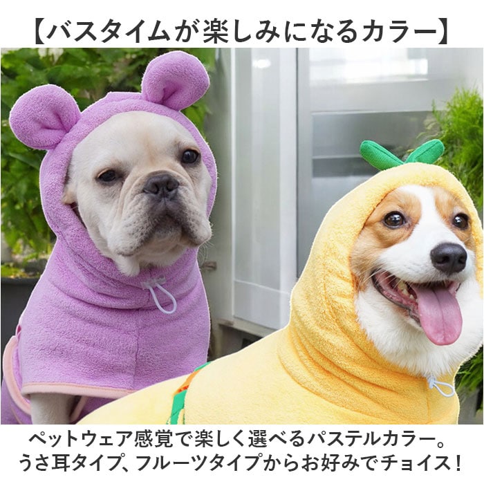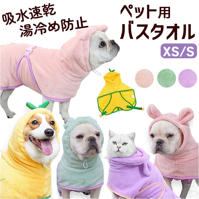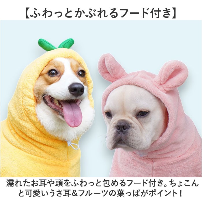 | 商品説明 | 【お洋服みたいに可愛いバスタオル♪】シャンプー後にふわっと着せて、簡単タオルドライ!吸水速乾に優れた「ペット用バスタオル」【パジャマ代わりに着て、湯冷め防止】お風呂上りにブルブルッと水しぶきを上げる元気なワンコに!洋服みたいに“着れる”バスタオル♪【ふんわりくるんで、サッと乾く】密度の高いマイクロファイバー繊維が濡れたペットの被毛から水分をグングン吸収!素早く乾く♪【着せ方はとっても簡単!3STEP】1.首回りの丸く開いた部分を広げてペットの頭にすっぽりかぶせ、マントのように背中の生地を優しく掛けたら、裾のゴムを両後ろ脚に引っ掛ける。2.前掛けビブを前脚の間からお腹の下に通し、裾のバックルベルトをクルっと身体に巻き付けて、背中で留める。3.フードを頭に被せて、首元をドローコードとキュッと絞ったら装着完了!【ふわっとかぶれるフード付き】濡れたお耳や頭をふわっと包めるフード付き。ちょこんと可愛いうさ耳&フルーツの葉っぱがポイント!【湯冷めが気になる季節でも安心】フードの縁はコードでキュッと絞れて、冷えやすいお腹周りもすっぽりカバー。湯冷め防止に効果的。【ドライヤーの時間をグッと短縮】ドライヤーの音を怖がるペットにも安心。体毛を乾かすための飼い主さんの手間と時間を短縮!【フリフリ尻尾を邪魔しないつくり】シッポが巻いたワンちゃんでも大丈夫!お尻周りに生地が掛からないコード付きでおトイレもスムーズ。【超小型~小型犬にピッタリサイズ】超小型犬や猫ちゃんにはXSサイズ、柴犬やコーギー等小~中型犬にぴったりのSサイズの2サイズ展開。※XSサイズは胴回り約52cm程度まで、Sサイズは胴回り60cm程度のワンちゃんに最適なサイズ感です。事前に愛犬の身体のサイズをご確認ください。【ご家庭でカンタンお洗濯♪】お手入れの楽なポリエステル混紡素材だから、手軽にお洗濯が可能!いつでも気持ちのよい着心地♪【お風呂上りや、雨の日にも大活躍】シャンプー後にすぐ遊び始めてしまうワンちゃんに最適!雨の日のお散歩後のタオルドライにも◎ |