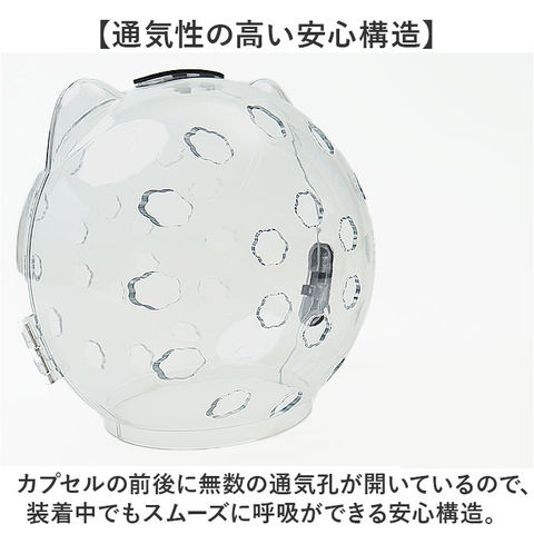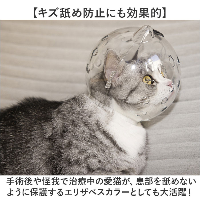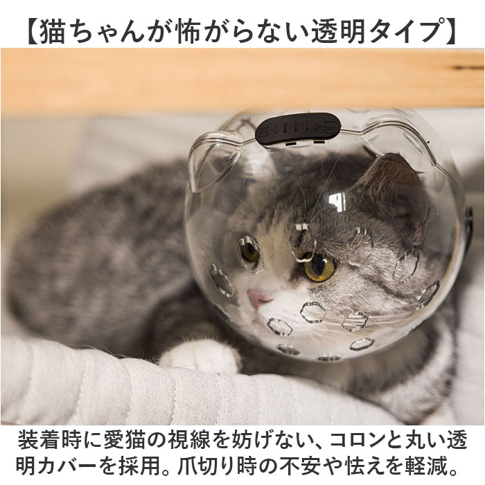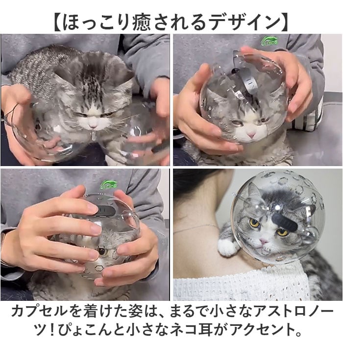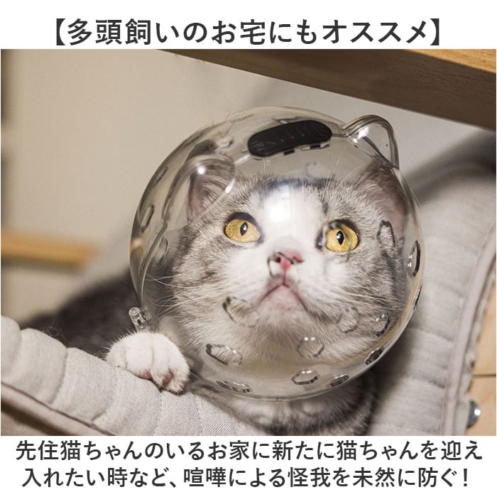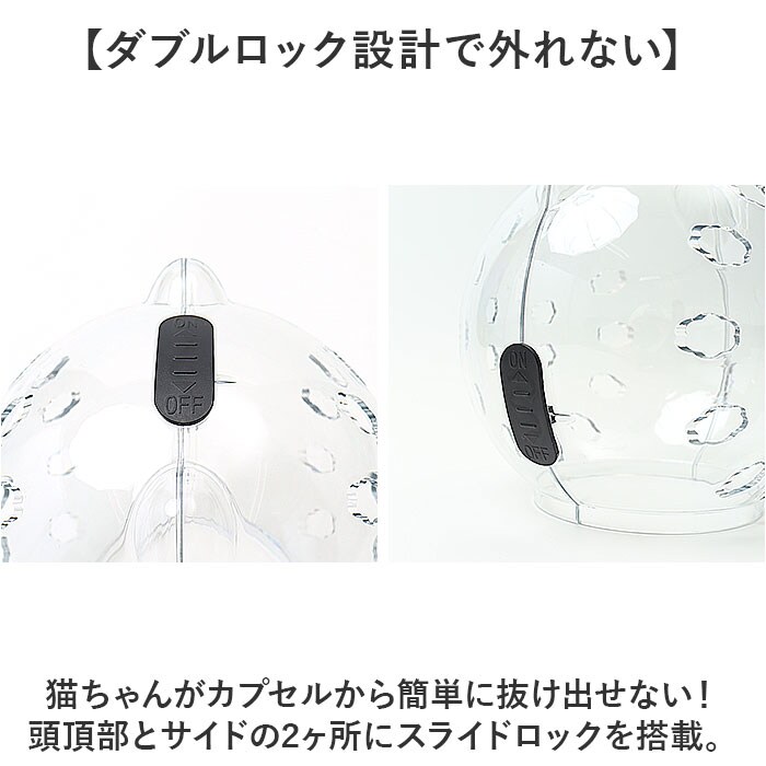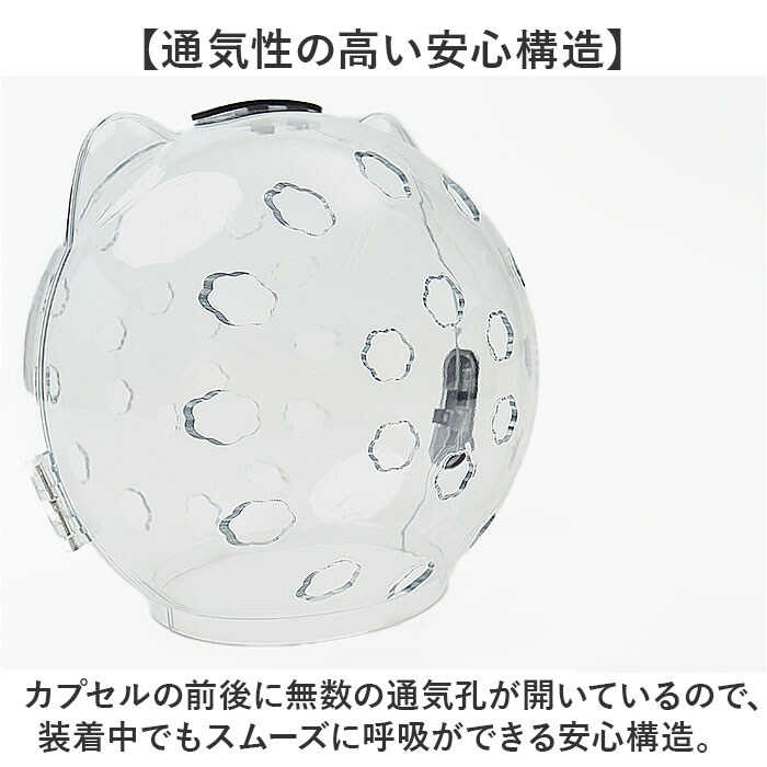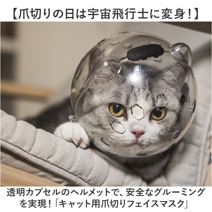 | 商品説明 | 【爪切りの日は宇宙飛行士に変身!】透明カプセルのヘルメットで、安全なグルーミングを実現!「キャット用爪切りフェイスマスク」【猫ちゃんが怖がらない透明タイプ】装着時に愛猫の視線を妨げない、コロンと丸い透明カバーを採用。爪切り時の不安や怯えを軽減。【通気性の高い安心構造】カプセルの前後に無数の通気孔が開いているので、装着中でもスムーズに呼吸ができる安心構造。【ダブルロック設計で外れない】猫ちゃんがカプセルから簡単に抜け出せない!頭頂部とサイドの2ヶ所にスライドロックを搭載。【グルーミング中の咬みつき防止】爪切りやワクチン接種、トリミングサロンのカットが苦手な猫ちゃんから、飼い主さんの手をガード。【キズ舐め防止にも効果的】手術後や怪我で治療中の愛猫が、患部を舐めないように保護するエリザベスカラーとしても大活躍!【多頭飼いのお宅にもオススメ】先住猫ちゃんのいるお家に新たに猫ちゃんを迎え入れたい時など、喧嘩による怪我を未然に防ぐ!【パカッと被せて、簡単装着!】1.予めロックを外した透明カプセルを両手のひらで支えながら、2つの半球体状に左右に広げる。2.開いた状態のカプセルを、猫ちゃんの頭を包み込むように前後からパカッと被せる。3.頭頂部とサイドの黒いロックボタンを「OFF」の方向にスライドさせたら装着完了!【ほっこり癒されるデザイン】カプセルを着けた姿は、まるで小さなアストロノーツ!ぴょこんと小さなネコ耳がアクセント。 |