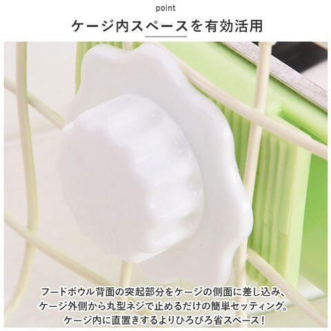 | 商品説明 | ペット用ケージに簡単取付!ワンちゃんもネコちゃんも使える「ハンガータイプ・フードボウル」が新登場。【ケージ内スペースを有効活用】フードボウル背面の突起部分をケージの側面に差し込み、ケージ外側から丸型ネジで止めるだけの簡単セッティング。ケージ内に直置きするよりひろびろ省スペース!【食べやすい高さに調節自在】フードボウルの高さや位置が自在に調節できるので、ワンちゃん・ネコちゃんの首に負担がかからず、快適なお食事タイムを実現!【サッと水洗いOK!】フードボウル本体は、丈夫で軽量なポリプロピレン素材を採用。気になる汚れがサッと水洗いできて、簡単キレイ。【選べる2サイズ展開】ボウルサイズは、ペットの身体の大きさ、フードの摂取量に合わせてチョイスできる、スモールサイズ・ラージサイズの2種類。【スクエア&サークル】ポップで色鮮やかなカラーと、お気に入りのフォルムが選べるスクエアタイプ(角型)とサークルタイプ(丸型)の豊富なラインナップ。【イヌ・ネコ共用タイプ】食欲旺盛なワンちゃんにはもちろん、ネコちゃんやフェレット、ウサギなどの小動物用にも最適。 |