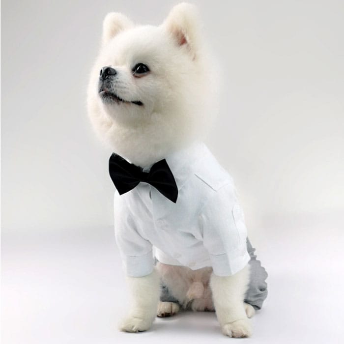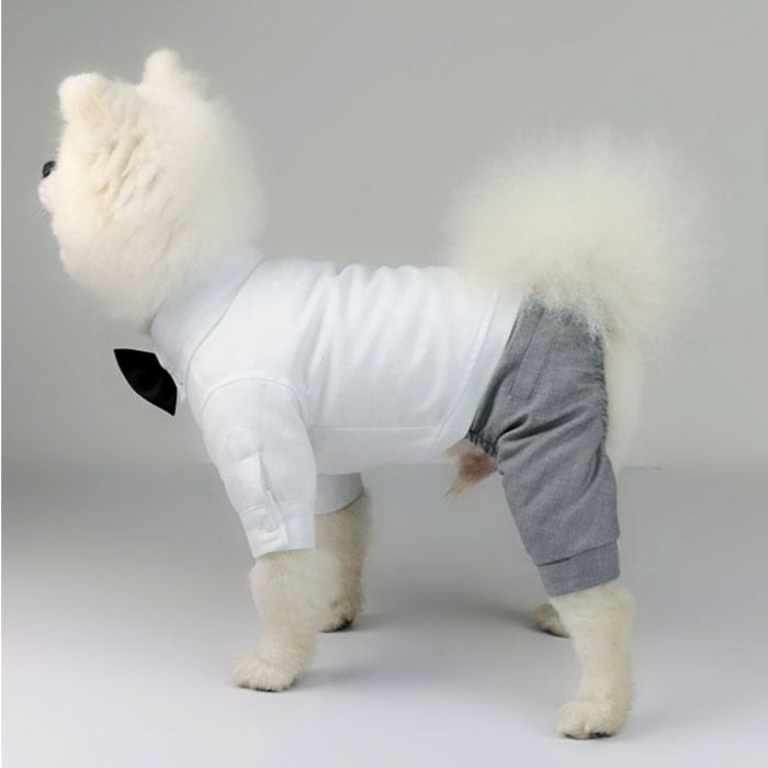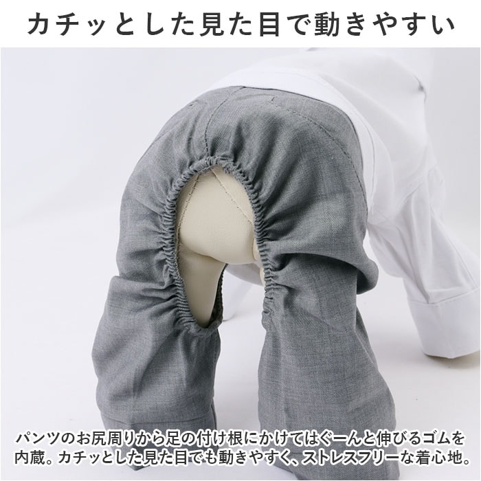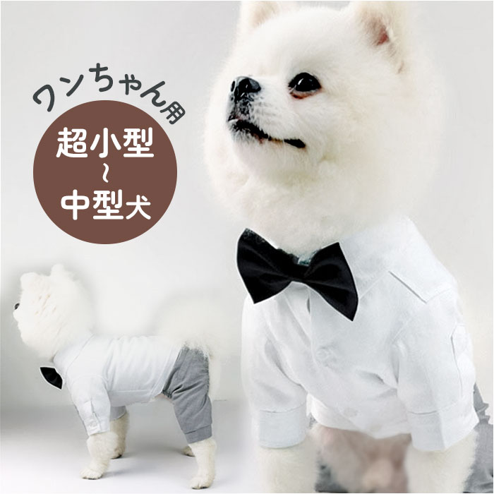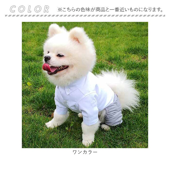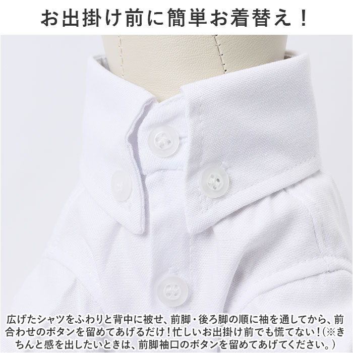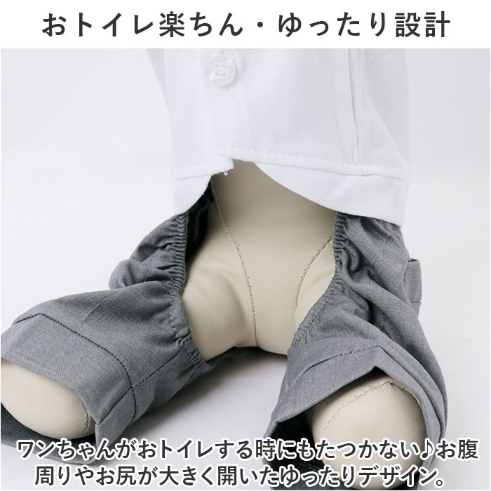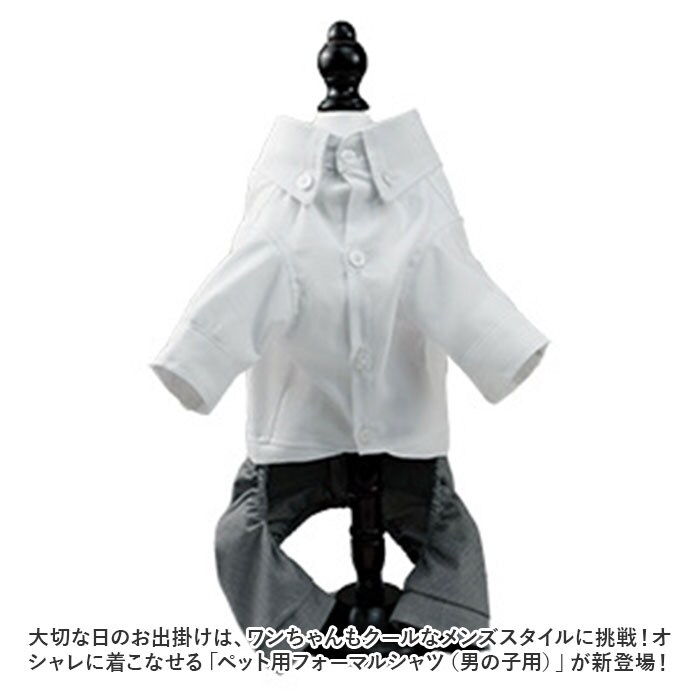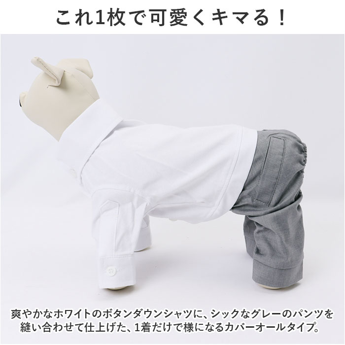 | 商品説明 | 大切な日のお出掛けは、ワンちゃんもクールなメンズスタイルに挑戦!オシャレに着こなせる「ペット用フォーマルシャツ(男の子用)」が新登場!【お祝いの席がパッと華やぐ】ご友人の結婚パーティーやお子さまの誕生パーティなどの特別な日は、ワンちゃんもフォーマルスタイルでおめかし!お祝いの席に華やかさを添えるペット用ドレスシャツ。【これ1枚で可愛くキマる!】爽やかなホワイトのボタンダウンシャツに、シックなグレーのパンツを縫い合わせて仕上げた、1着だけで様になるカバーオールタイプ。【お出掛け前に簡単お着替え!】広げたシャツをふわりと背中に被せ、前脚・後ろ脚の順に袖を通してから、前合わせのボタンを留めてあげるだけ!忙しいお出掛け前でも慌てない!(※きちんと感を出したいときは、前脚袖口のボタンを留めてあげてください。)【カチッとした見た目で動きやすい】パンツのお尻周りから足の付け根にかけてはぐーんと伸びるゴムを内蔵。カチッとした見た目でも動きやすく、ストレスフリーな着心地。【おトイレ楽ちん・ゆったり設計】ワンちゃんがおトイレする時にもたつかない♪お腹周りやお尻が大きく開いたゆったりデザイン。【ご家庭で簡単お洗濯♪】取り扱いが楽な綿混素材なので、オシャレ着用洗剤などで優しく手洗いすれば、ご家庭でも手軽にお洗濯が可能。こまめにお手入れしていつでも清潔な着心地。(※手洗いでお手入れをオススメいたします。)【ピッタリサイズをチョイス!】XSサイズから2XLサイズまでの6つのサイズから、ぴったりサイズがチョイス可能!超小型犬から、胴回り56cm程度までの中型のワンちゃんに最適なサイズ感。【飼い主さんとリンクコーデも】シャツの胸元に蝶ネクタイをちょこんと着けたら、可愛らしい小さな紳士のできあがり!飼い主さんのタキシードやスーツに合わせてリンクコーデも自在。(※本商品に蝶ネクタイは付属しておりません。) |