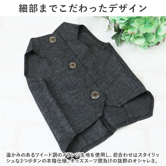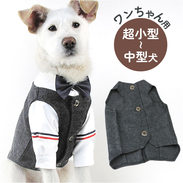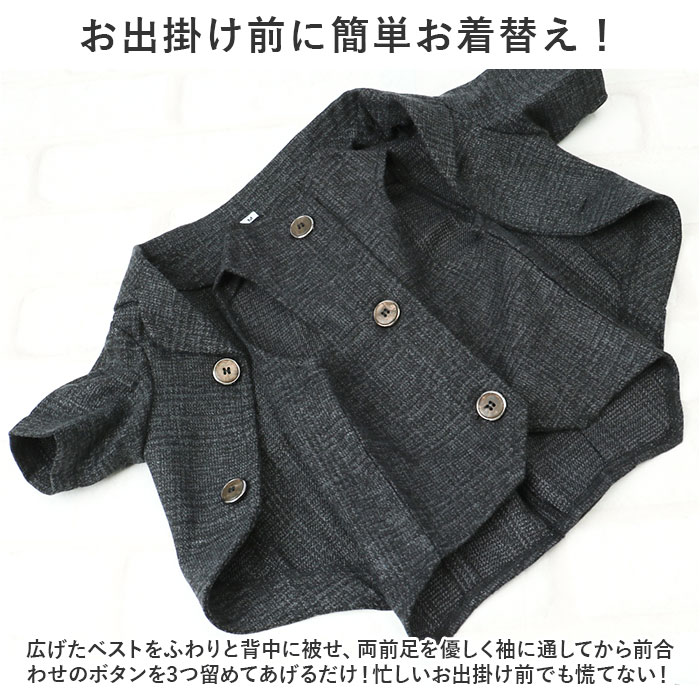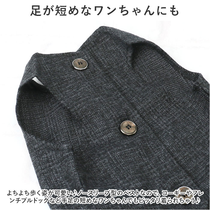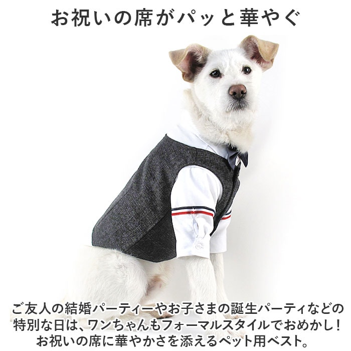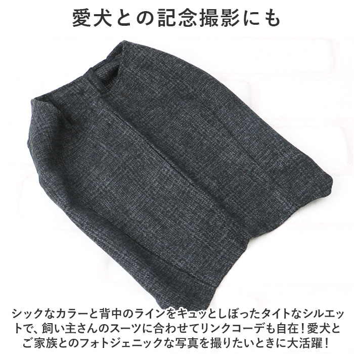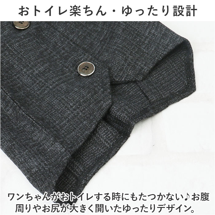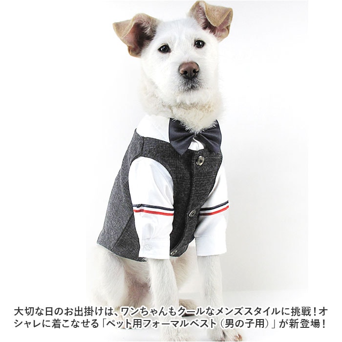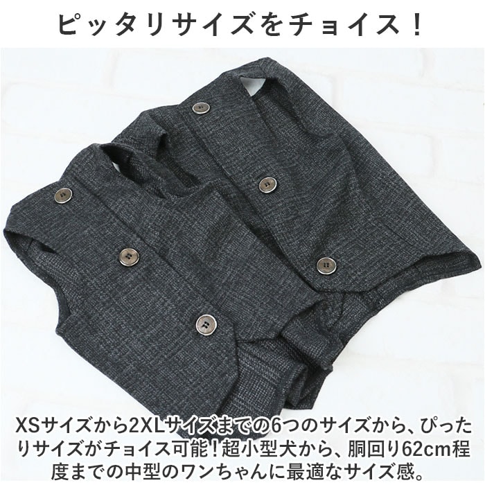 | 商品説明 | 大切な日のお出掛けは、ワンちゃんもクールなメンズスタイルに挑戦!オシャレに着こなせる「ペット用フォーマルベスト(男の子用)」が新登場!【お祝いの席がパッと華やぐ】ご友人の結婚パーティーやお子さまの誕生パーティなどの特別な日は、ワンちゃんもフォーマルスタイルでおめかし!お祝いの席に華やかさを添えるペット用ベスト。【細部までこだわったデザイン】温かみのあるツイード調のメランジ生地を使用し、前合わせはスタイリッシュな3つボタンの本格仕様。キッズスーツ顔負けの抜群のオシャレさ。【お出掛け前に簡単お着替え!】広げたベストをふわりと背中に被せ、両前足を優しく袖に通してから前合わせのボタンを3つ留めてあげるだけ!忙しいお出掛け前でも慌てない!【足が短めなワンちゃんにも】よちよち歩く姿が可愛い♪ノースリーブ型のベストなので、コーギーやフレンチブルドッグなど手足の短めなワンちゃんでもピッタリ着られちゃう♪【おトイレ楽ちん・ゆったり設計】ワンちゃんがおトイレする時にもたつかない♪お腹周りやお尻が大きく開いたゆったりデザイン。【ピッタリサイズをチョイス!】XSサイズから2XLサイズまでの6つのサイズから、ぴったりサイズがチョイス可能!超小型犬から、胴回り62cm程度までの中型のワンちゃんに最適なサイズ感。【愛犬との記念撮影にも】シックなカラーと背中のラインをキュッとしぼったタイトなシルエットで、飼い主さんのスーツに合わせてリンクコーデも自在!愛犬とご家族とのフォトジェニックな写真を撮りたいときに大活躍! |