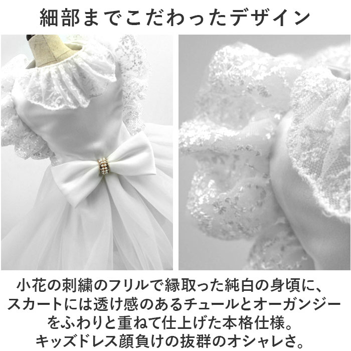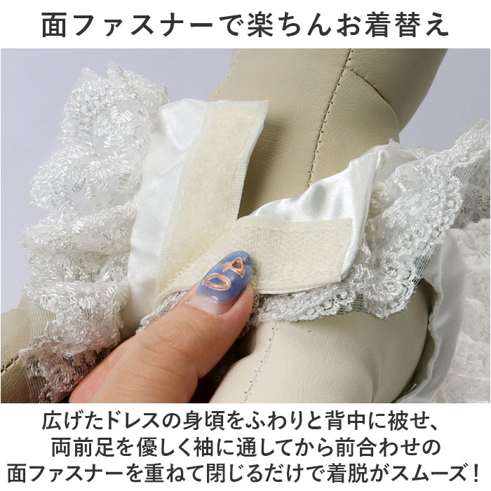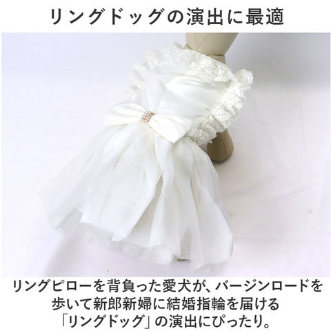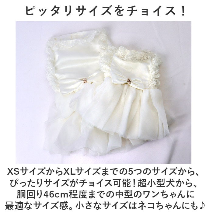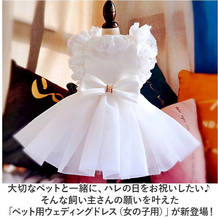 | 商品説明 | 大切なペットと一緒に、ハレの日をお祝いしたい♪そんな飼い主さんの願いを叶えた「ペット用ウェディングドレス(女の子用)」が新登場!【お祝いの席がパッと華やぐ】飼い主さんの結婚式やパーティなどの特別な日は、ワンちゃんもチュールがひらめくドレスで可愛くおめかし。お祝いの席に華やかさを添えるペット用ドレス。【リングドッグの演出に最適】リングピローを背負った愛犬が、バージンロードを歩いて新郎新婦に結婚指輪を届ける「リングドッグ」の演出にぴったり。【細部までこだわったデザイン】小花の刺繍のフリルで縁取った純白の身頃に、スカートには透け感のあるチュールとオーガンジーをふわりと重ねて仕上げた本格仕様。キッズドレス顔負けの抜群のオシャレさ。【面ファスナーで楽ちんお着替え】広げたドレスの身頃をふわりと背中に被せ、両前足を優しく袖に通してから前合わせの面ファスナーを重ねて閉じるだけで着脱がスムーズ!【おトイレ楽ちん・ゆったり設計】ワンちゃんがおトイレする時にもたつかない♪お腹周りやお尻が大きく開いたゆったりデザイン。(※おトイレの時は、飼い主さんがスカートのチュールを束ねて、押さえてあげてください。)【ピッタリサイズをチョイス!】XSサイズからXLサイズまでの5つのサイズから、ぴったりサイズがチョイス可能!超小型犬から、胴回り46cm程度までの中型のワンちゃんに最適なサイズ感。小さなサイズはネコちゃんにも♪【ホームパーティにも大活躍】飼い主さんの結婚式にはもちろん、ご友人を招いてのホームパーティや、屋外でのウェディングパーティーにお呼ばれしたときにも大活躍!【愛犬との記念撮影にも】チュールの上でふわりと結んだ真っ白なリボンと、ラインストーンの縁取りがきらめくリボン留めのパールビジューがアクセント。愛犬とご家族とのフォトジェニックな写真を撮りたいときにオススメ。 |