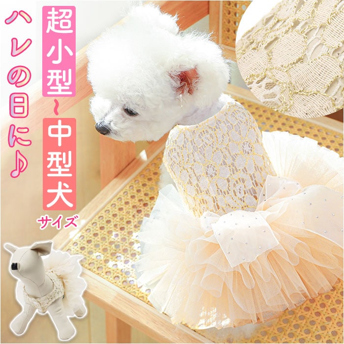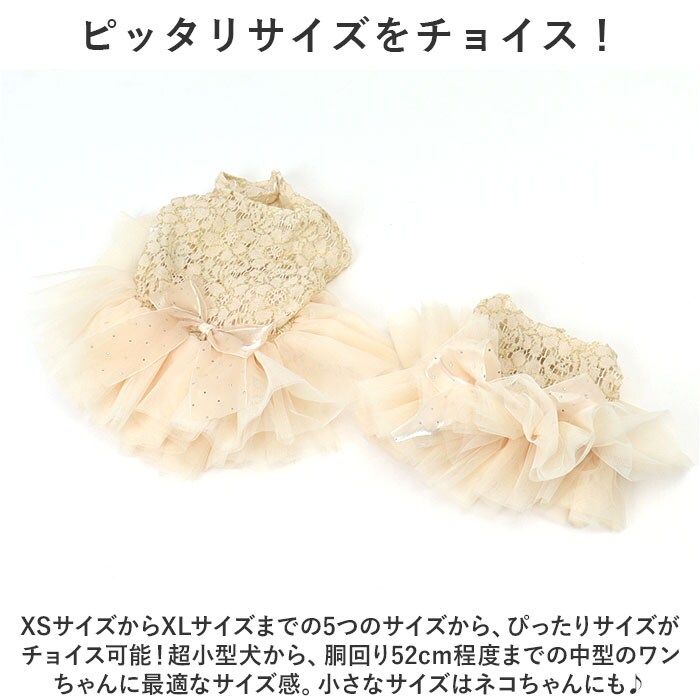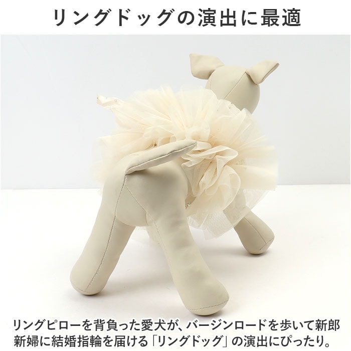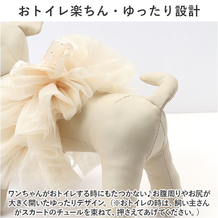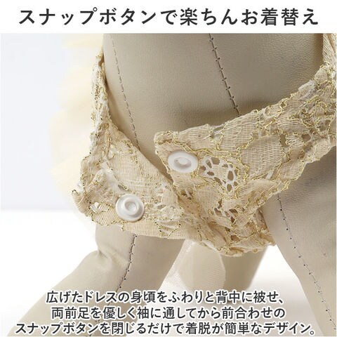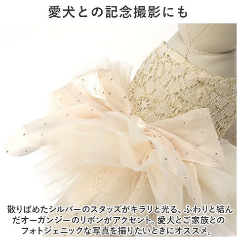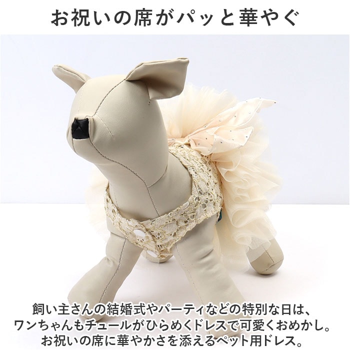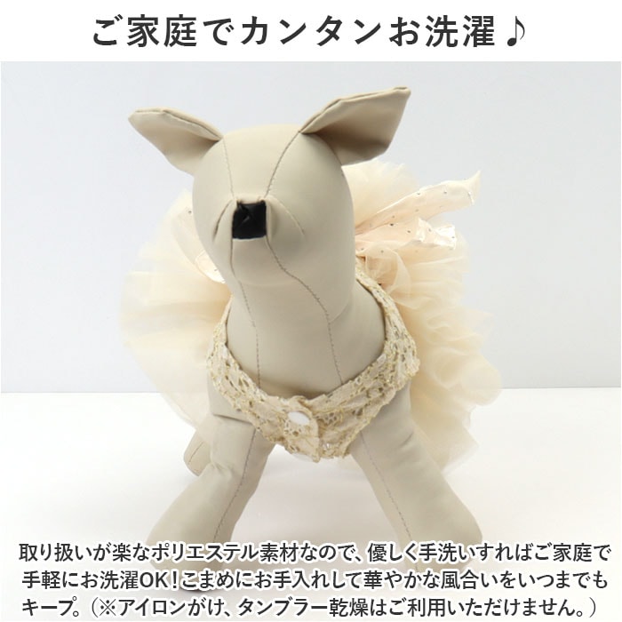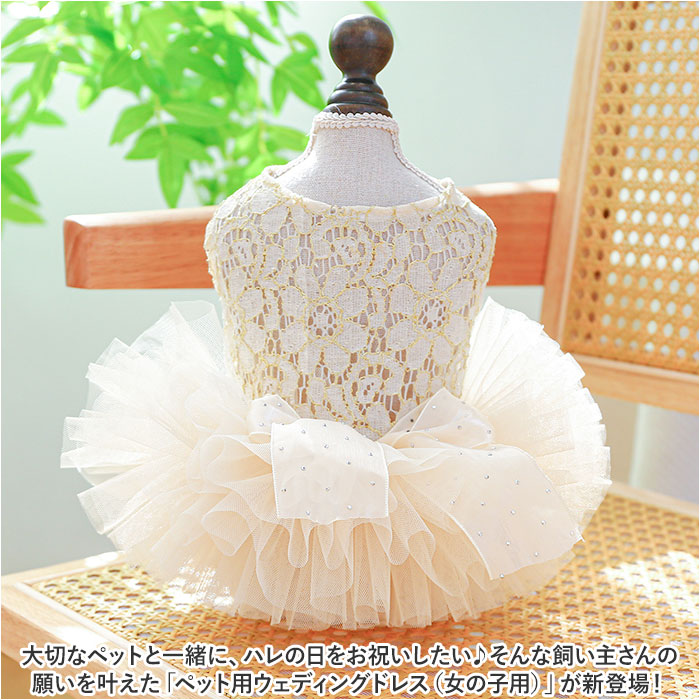 | 商品説明 | 大切なペットと一緒に、ハレの日をお祝いしたい♪そんな飼い主さんの願いを叶えた「ペット用ウェディングドレス(女の子用)」が新登場!【お祝いの席がパッと華やぐ】飼い主さんの結婚式やパーティなどの特別な日は、ワンちゃんもチュールがひらめくドレスで可愛くおめかし。お祝いの席に華やかさを添えるペット用ドレス。【リングドッグの演出に最適】リングピローを背負った愛犬が、バージンロードを歩いて新郎新婦に結婚指輪を届ける「リングドッグ」の演出にぴったり。【細部までこだわったデザイン】小花のカタチのレースを金のラメ糸で縁取ったビスチェ風の身頃に、スカートには透け感のある可憐なチュールをふんわり重ねて仕上げた本格仕様。キッズドレス顔負けの抜群のオシャレさ。【スナップボタンで楽ちんお着替え】広げたドレスの身頃をふわりと背中に被せ、両前足を優しく袖に通してから前合わせのスナップボタンを閉じるだけで着脱が簡単なデザイン。【おトイレ楽ちん・ゆったり設計】ワンちゃんがおトイレする時にもたつかない♪お腹周りやお尻が大きく開いたゆったりデザイン。(※おトイレの時は、飼い主さんがスカートのチュールを束ねて、押さえてあげてください。)【ご家庭でカンタンお洗濯♪】取り扱いが楽なポリエステル素材なので、優しく手洗いすればご家庭で手軽にお洗濯OK!こまめにお手入れして華やかな風合いをいつまでもキープ。(※アイロンがけ、タンブラー乾燥はご利用いただけません。)【ホームパーティにも大活躍】飼い主さんの結婚式にはもちろん、ご友人を招いてのホームパーティや、屋外でのウェディングパーティーにお呼ばれしたときにも大活躍!【愛犬との記念撮影にも】散りばめたシルバーのスタッズがキラリと光る、ふわりと結んだオーガンジーのリボンがアクセント。愛犬とご家族とのフォトジェニックな写真を撮りたいときにオススメ。 |
