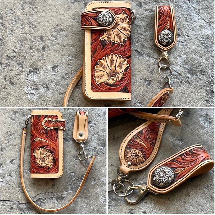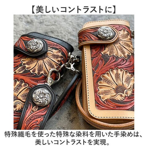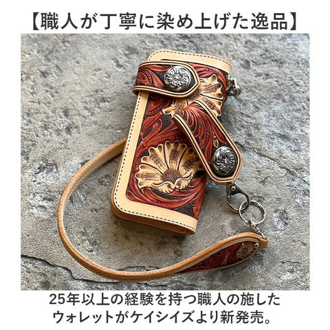 | 商品説明 | 【職人が丁寧に染め上げた逸品】・25年以上の経験を持つ職人の施したウォレットがケイシイズより新発売。【KC.s(ケイシイズ)】素材、染色、裁縫、部位全ての項目に拘った革製品ブランドKC.s(ケイシイズ)。【手彫りで描かれた花模様】表面の絵柄はすべてカービングよる手彫り作業で描き、職人の技術を詰め込んだアイテム。※1【美しいコントラストに】特殊繊毛を使った特殊な染料を用いた手染めは、美しいコントラストを実現。【充実した収納】・10個のカードポケットや5つのフリーポケットを設け収納力抜群♪【U字にカットされたポケット】・ポケットの開口部はU字にカットされたデザインでカードや領収書もスムーズに取り出せる。【ブランドオリジナル刻印】Dカンとフラップ内部にはブランドロゴの刻印付き。細かい所までこだわりアリ◎【年代問わず使えるデザイン】繊細で華やかな花の絵柄が女性らしいデザインに。派手すぎないカラーで大人女子さんにも◎【大きな存在感のある留め具】留め具は大きな花デザインのスナップボタン。中央のビジューがキラッと輝くアクセント♪【雰囲気を壊さないベルト付属】・2本ベルトを付属。どちらもベルト全体にカービングを施し華やかな印象の仕上がりに。※2【ギフトにもオススメ】化粧箱のパッケージに入っているので、そのままギフトに贈るのもオススメ♪【ポケット仕様】カードポケット×10、フリーポケット×5、お札入れ×1、小銭入れ×1※1 カービングとは何種類もの専用工具を使い手彫りで柄を描く職人技術※2 付属品・・・・ロングベルト×1 ショートベルト×1 |