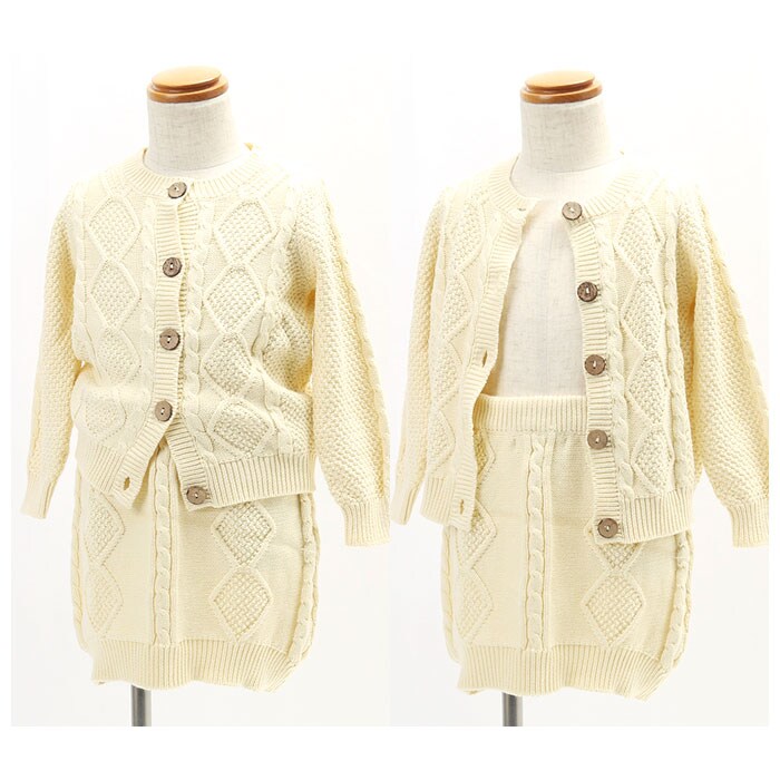 | 商品説明 | アラン編みが可愛いニットのセットアップが登場。単色ながらも網目模様が浮かび上がるシンプルで華やかなデザイン。お出かけ用にもピッタリ◎素材は優しい肌触りのコットン100%の生地を使用。トップスはナチュラルな素材感のボタンがアクセント♪ボタンを閉めてニットとして、ボタンを開けてカーディガンとしても使える。スカートのウエストにはしっかりとした幅広のゴムを使用し、脱ぎ着もらくらく。 |