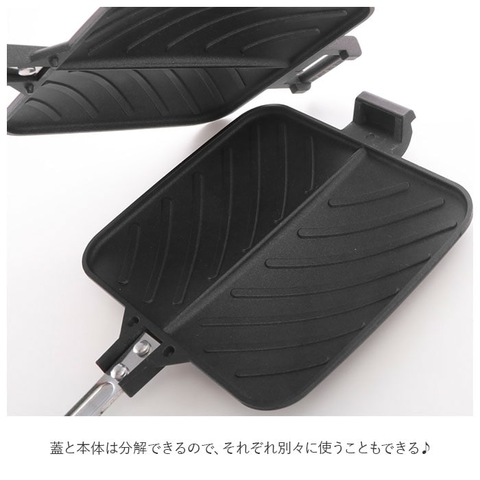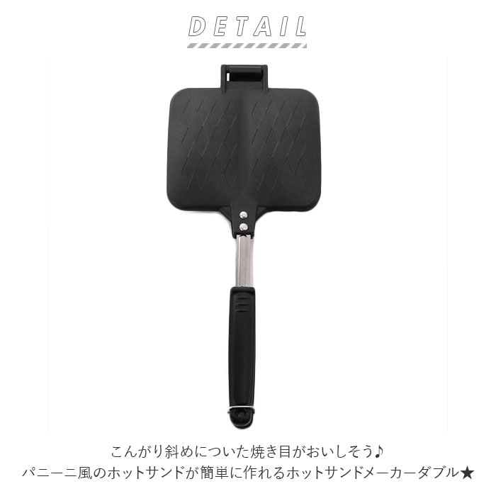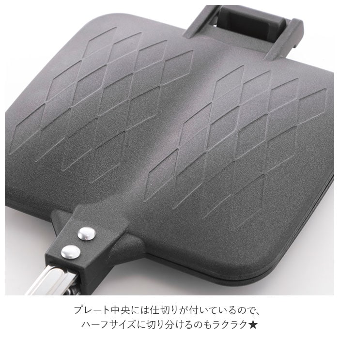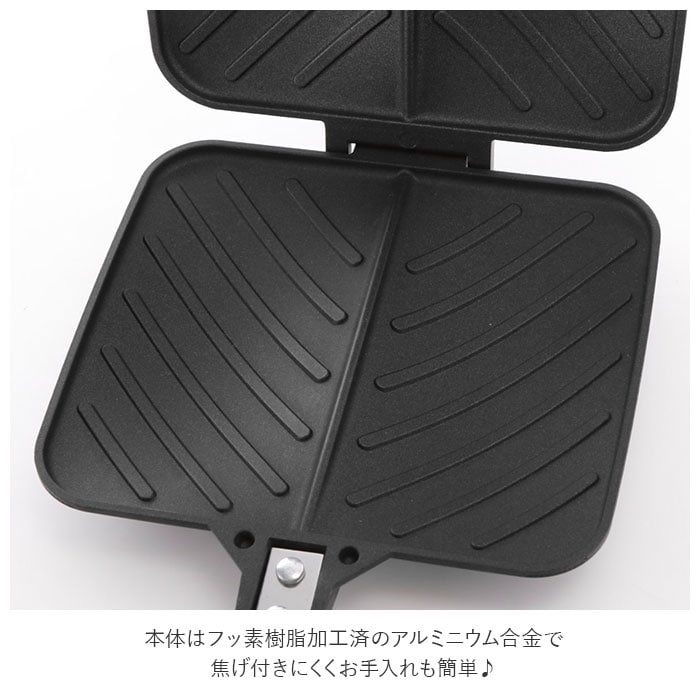 | 商品説明 | こんがり斜めについた焼き目がおいしそう♪パニーニ風のホットサンドが簡単に作れるホットサンドメーカーダブル★お好きな食材を食パンなどに挟んで焼くだけ!斜めの焼き目がお洒落なパニーニ風ホットサンドが簡単に作れる♪プレート中央には仕切りが付いているので、ハーフサイズに切り分けるのもラクラク★本体はフッ素樹脂加工済のアルミニウム合金で焦げ付きにくく、お手入れも簡単♪ガスコンロ専用プレートだから本体を丸ごと洗えて長く使えるのが嬉しい! |