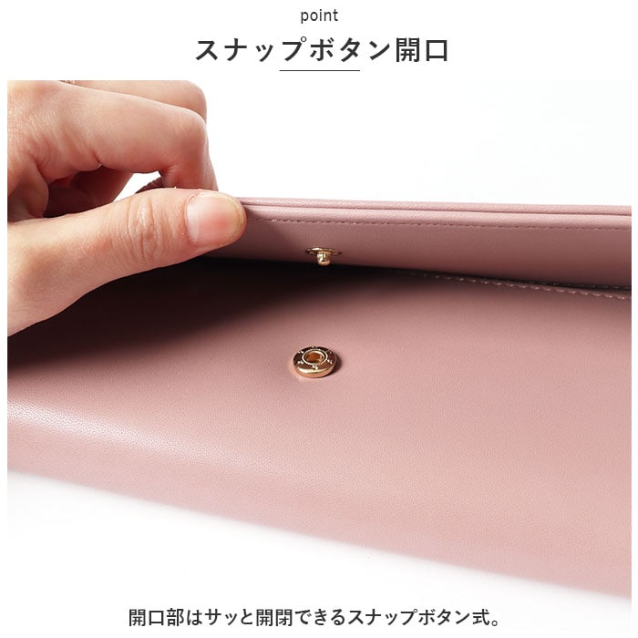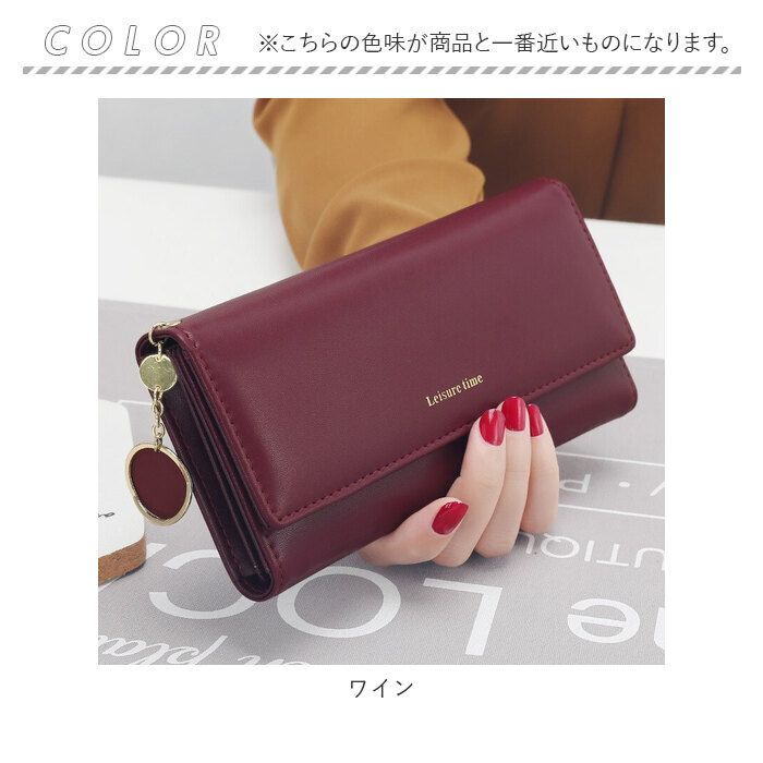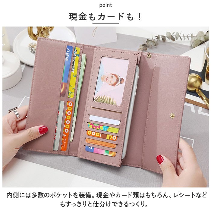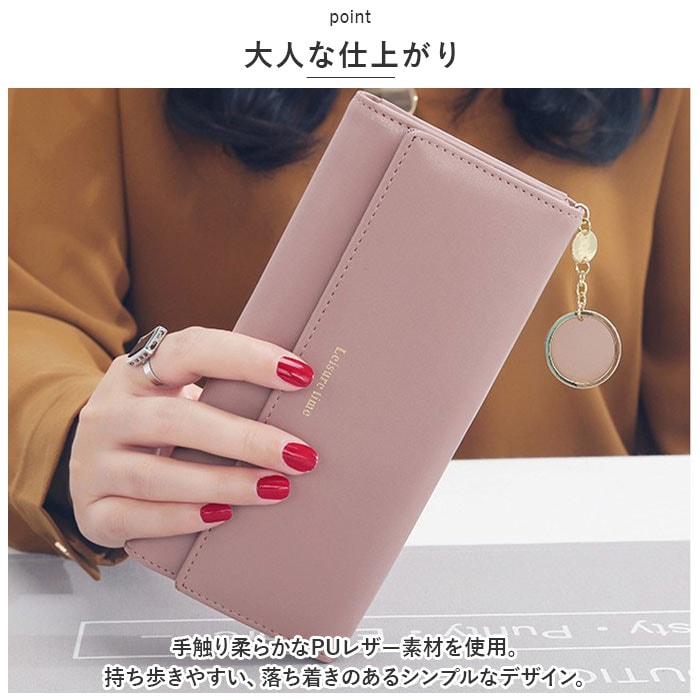 | 商品説明 | たっぷり入って使い勝手抜群な長財布が新登場。【大人な仕上がり】手触り柔らかなPUレザー素材を使用。持ち歩きやすい、落ち着きのあるシンプルなデザイン。【スナップボタン開口】開口部はサッと開閉できるスナップボタン式。【現金もカードも!】内側には多数のポケットを装備。現金やカード類はもちろん、レシートなどもすっきりと仕分けできるつくり。【アクセントをプラス】ゴールド&お財布と同じカラーのラウンドチャーム付き♪【ポケット仕様】内側:フリーポケット×3、ファスナーポケット×1、横型カードポケット×4、縦型カードポケット×6(1つは半透明仕様) |