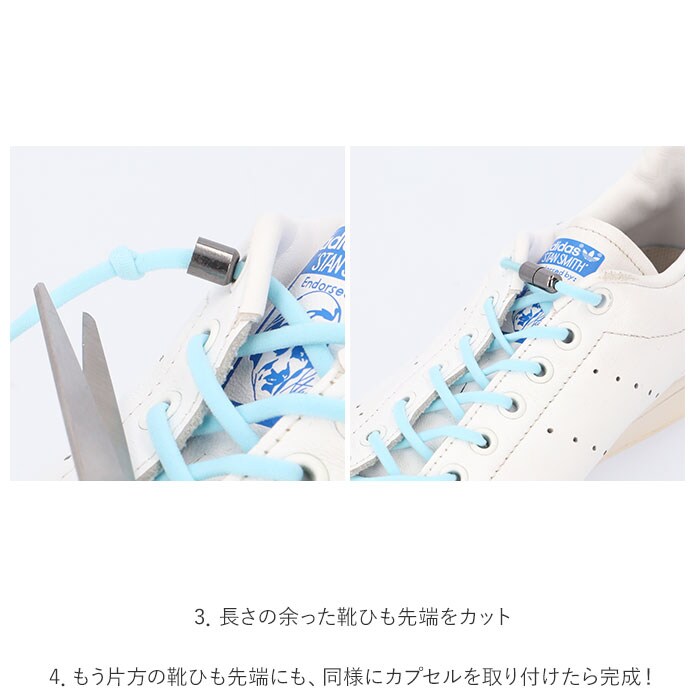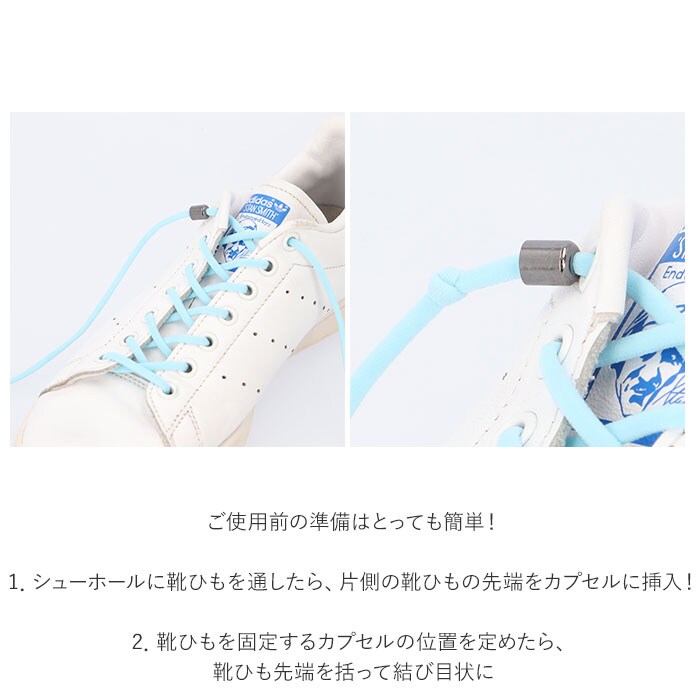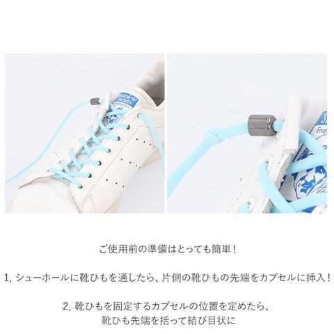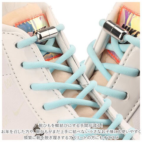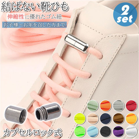 | 商品説明 | カプセルロック式で、簡単ホールド!靴ひもを結びなおす手間のない、その名も「結ばない靴ひも」が2本セットになった新登場!毎朝シューズを履く時や、頻繁にほどけてしまう靴ひもの結びなおしの手間から解放!クルクルっとカプセルを回して留めるだけで、しっかりと固定。蝶結びをする必要のない画期的な靴ひも。ご使用前の準備はとっても簡単!・1.シューホールに靴ひもを通したら、片側の靴ひもの先端をカプセルに挿入!・2.靴ひもを固定するカプセルの位置を定めたら、靴ひも先端を括って結び目状に。・3.長さの余った靴ひも先端をカット。・4.もう片方の靴ひも先端にも、同様にカプセルを取り付けたら完成!靴ひもには、甲幅の広い方でも締め付け感の少ない、伸縮性に優れたゴム紐を採用。スリッポンのようにつま先をスッと通すことができるので、着脱時のストレスフリー。靴ひもを蝶結びにする手間が減り、玄関先でもたつくことなく、スムーズにお出掛けできる!お年を召した方や、靴ひもがまだ上手に結べない小さなお子様にも使いやすく、頻繁に靴を脱ぎ履きするアスリートの方にもオススメ。お気に入りのカラーに気軽に着せ替えできる、豊富なカラーバリエーションも魅力。カップルや兄弟でリンクコーデが楽しめる同色2本セット。 |
