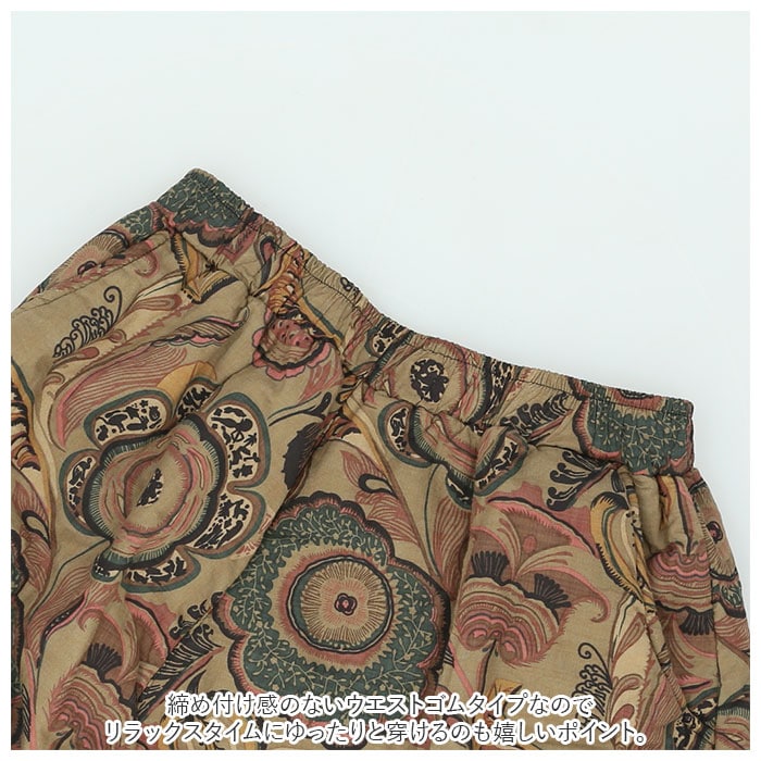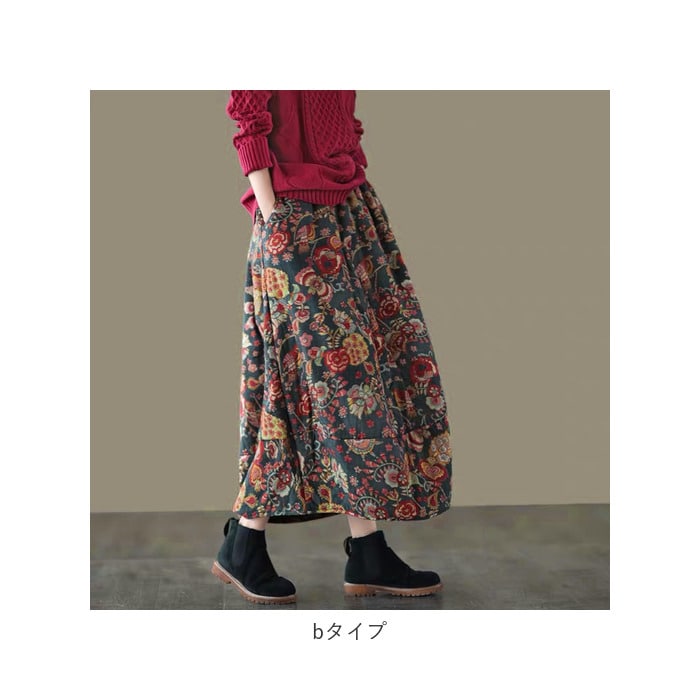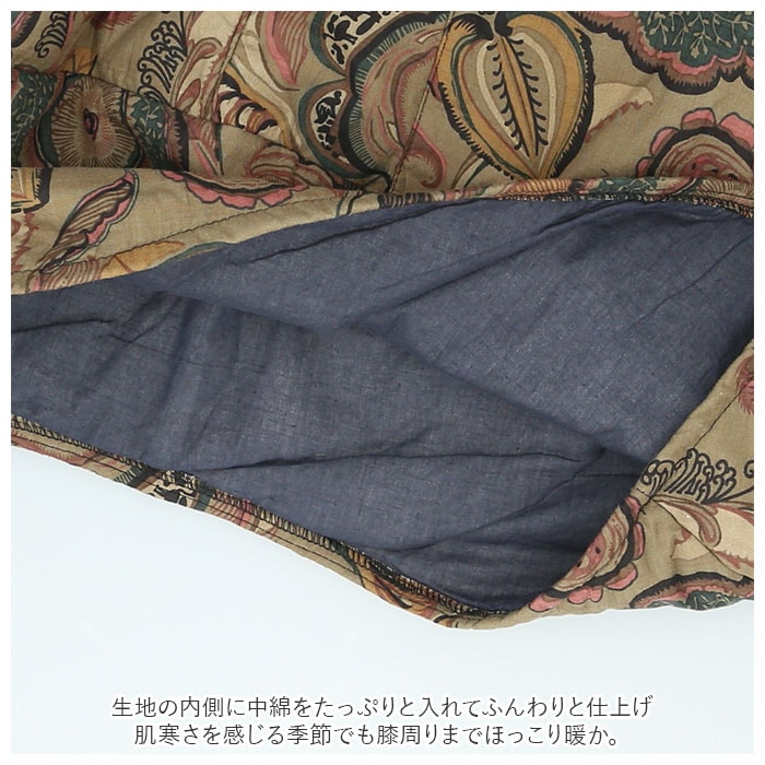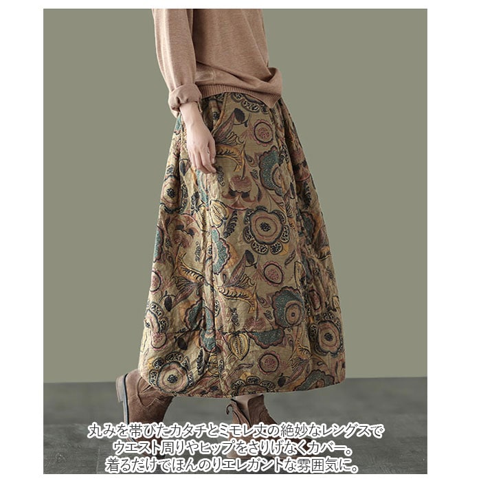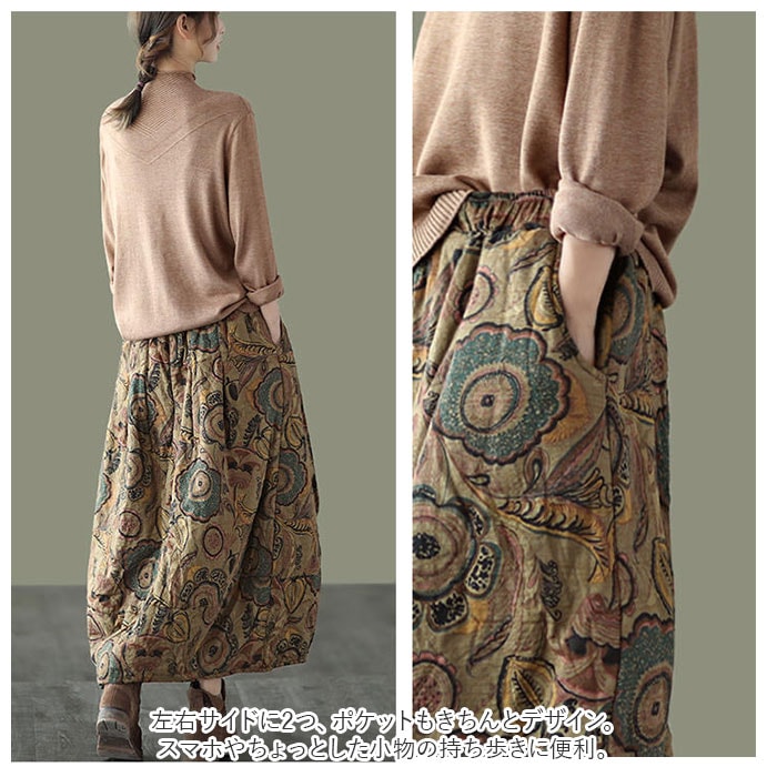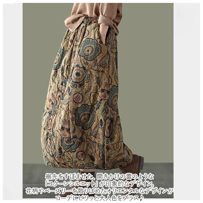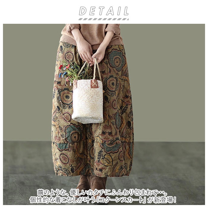 | 商品説明 | 繭のような、優しいカタチにふんわり包まれて・・・。個性的な着こなしが叶う「コクーンスカート」が新登場!裾先をすぼませた、開きかけの蕾のような「コクーンシルエット」が印象的なデザイン。生地にはサラリとした肌触りが心地よい、綿麻混紡素材を使用。生地の内側に中綿をたっぷりと入れてふんわりと仕上げ、肌寒さを感じる季節でも膝周りまでほっこり暖か。締め付け感のないウエストゴムタイプなので、リラックスタイムにゆったりと穿けるのも嬉しいポイント。左右サイドに2つ、ポケットもきちんとデザイン。スマホやちょっとした小物の持ち歩きに便利。丸みを帯びたカタチとミモレ丈の絶妙なレングスで、ウエスト周りやヒップをさりげなくカバー。着るだけでほんのりエレガントな雰囲気に。花柄やペーズリーを散りばめたオリエンタルなデザインがコーデにピリッと大人色をプラス♪自分らしい着こなしを求めていた方にぴったり。 |