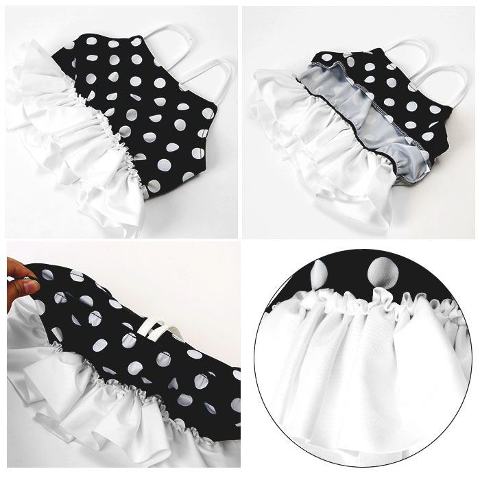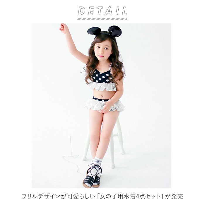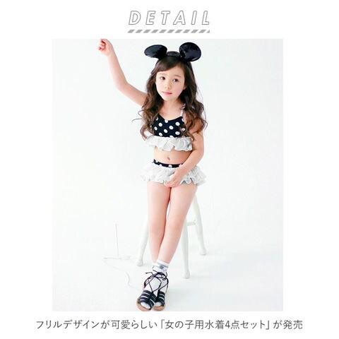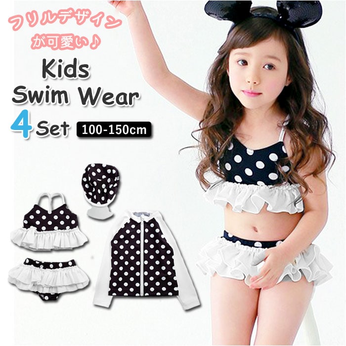 | 商品説明 | フリルデザインが可愛らしい「女の子用水着4点セット」が発売。ラッシュガードは肌の露出を抑えたい時に◎着脱に便利なジップタイプ。ブラトップはゴム入りで、着脱しやすい仕様に!150cmサイズのみ胸当てが内蔵された二重構造。パンツはお腹周りを絞めつけ過ぎないゴム入り。2段フリルがスカートの様に見えてとってもキュート。帽子はアゴ紐で結ぶタイプだから、サイズ調節ができ、外れにくく安心。欲しい物がセットになった嬉しいアイテム。 |
