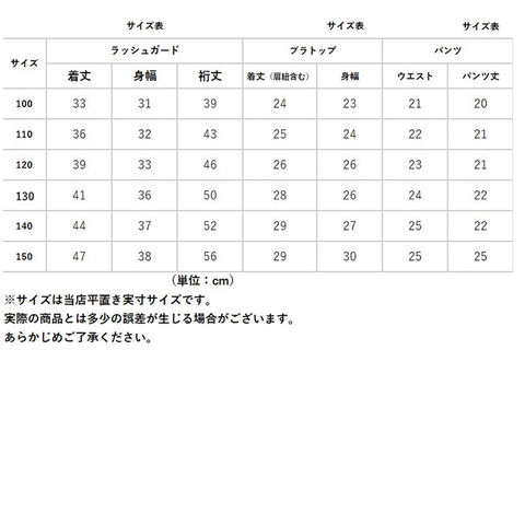 | 重量 | 【ラッシュガード】約97g 【ブラトップ】約44g 【パンツ】約84g 【帽子】約30g(120cmサイズの重量です) |