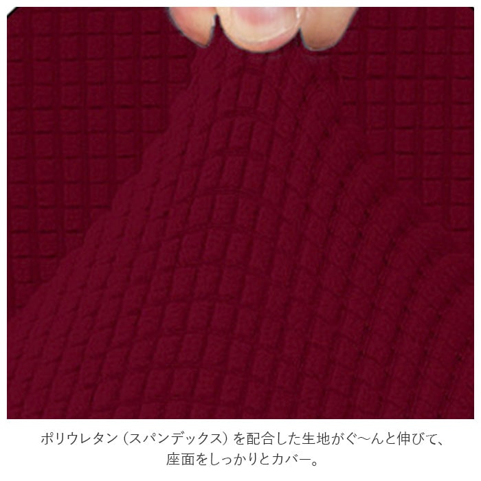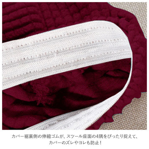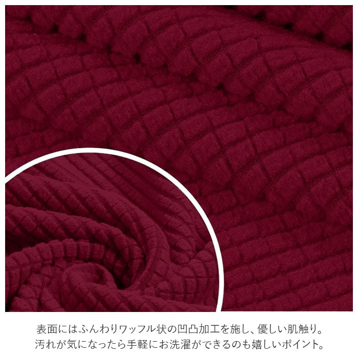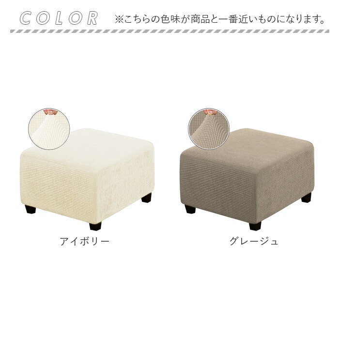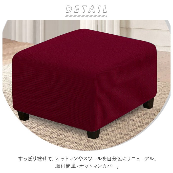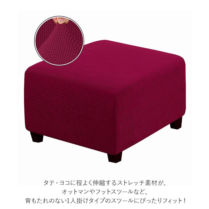 | 商品説明 | すっぽり被せて、オットマンやスツールを自分色にリニューアル。取付簡単・オットマンカバー。タテ・ヨコに程よく伸縮するストレッチ素材が、オットマンやフットスツールなど、背もたれのない1人掛けタイプのスツールにぴったりフィット!ポリウレタン(スパンデックス)を配合した生地がぐ~んと伸びて、座面をしっかりとカバー。頻繁に足を載せて擦り切れてしまったスツールも気軽に着せ替えできちゃう♪カバー裾裏側の伸縮ゴムが、スツール座面の4隅をぴったり捉えて、カバーのズレやヨレも防止!表面にはふんわりワッフル状の凹凸加工を施し、優しい肌触り。汚れが気になったら手軽にお洗濯ができるのも嬉しいポイント。お子さまの食べこぼし汚れや、ネコちゃんの爪とぎ跡でくたびれてしまったオットマンも簡単イメージチェンジ。インテリアにマッチするカラーで模様替えすれば、お部屋も気持ちもリフレッシュ! |