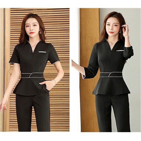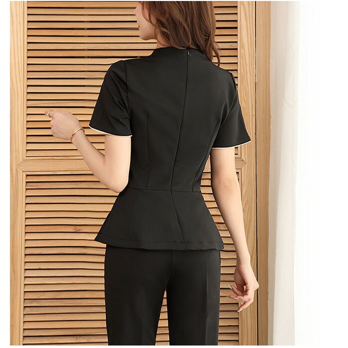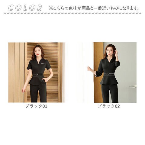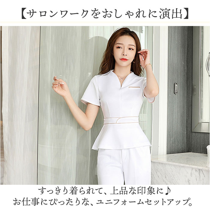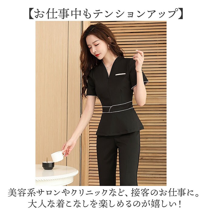 | 商品説明 | 【サロンワークをおしゃれに演出】すっきり着られて、上品な印象に♪お仕事にぴったりな、ユニフォームセットアップ。【お仕事中もテンションアップ】美容系サロンやクリニックなど、接客のお仕事に。大人な着こなしを楽しめるのが嬉しい!【サクッとキマる便利なセットアップ】半袖oe七分袖のトップスと、ロングパンツのセット。すらりとしたスタイルの完成☆【着脱しやすく自分サイズにフィット】トップスはバックファスナー、パンツはフロントボタンとファスナー。程よいストレッチ性も。【すっきり見せるVライントップス】華奢なネックレスも映える、深さのあるVネック。ラウンデザインは、ウエストマークに。(※)胸元のポケットはフェイクです。【締め付けがなくストレスフリー】パンツはバックゴム仕様。すとんと落ちるストレートラインに、サイドポケットを配置。【お気に入りを選べるカラー】清潔感があり、スタイリッシュにキマるモノトーンカラー。お気に入りの制服で楽しくお仕事♪ |