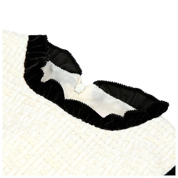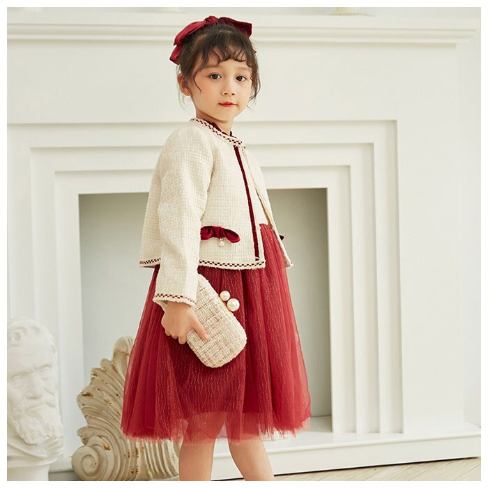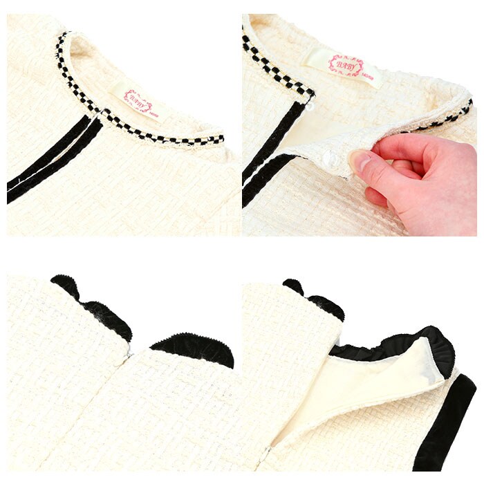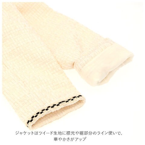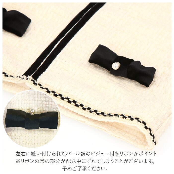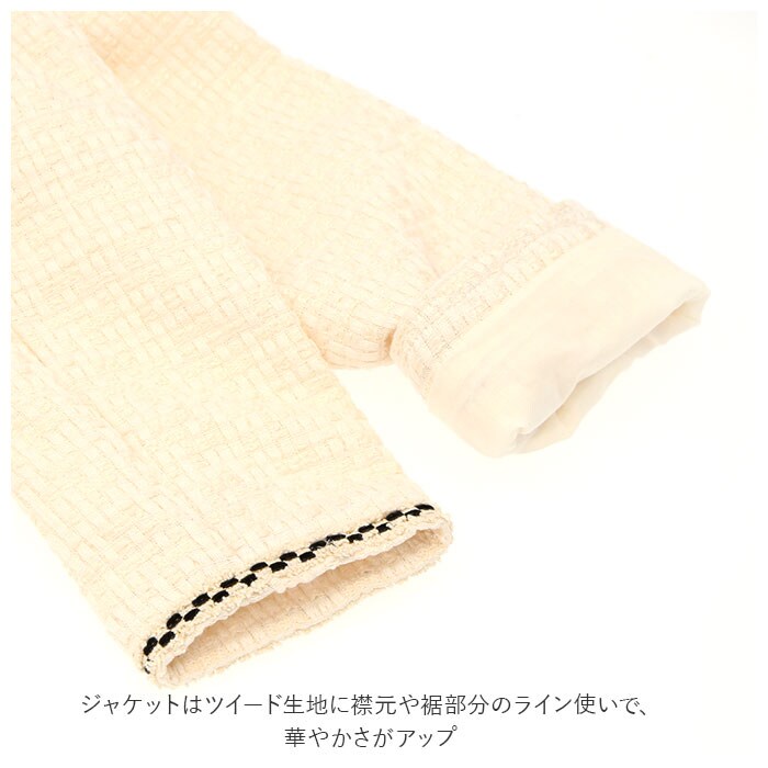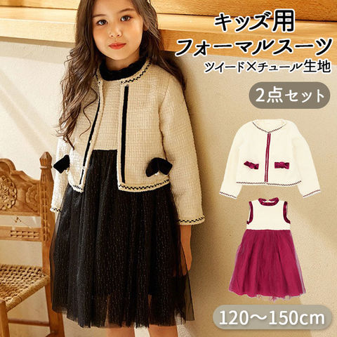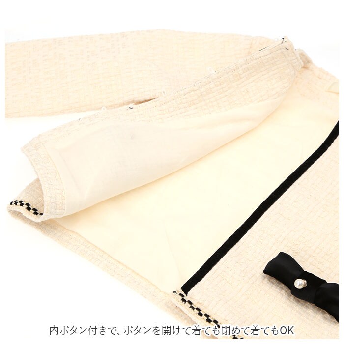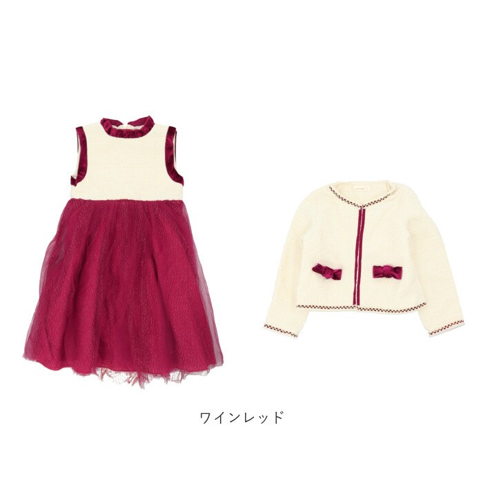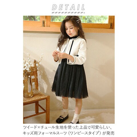 | 商品説明 | ツイード×チュール生地を使った上品で可愛らしい、キッズ用フォーマルスーツ(ワンピースタイプ)が発売。ノースリーブタイプのワンピースとジャケットのセットアップ。ワンピースの上身頃はツイード生地&ベロア調、スカート部分はチュール生地を使用した、切り替えデザインがおしゃれ♪ジャケットはツイード生地に襟元や裾部分のライン使いで、華やかさがアップ。左右に縫い付けられた、パール調のビジュー付きリボンがポイント。内ボタン付きで、ボタンを開けて着ても閉めて着てもOK。愛らしさと気品を兼ね備えたデザインなので、入学式や卒業式、発表会などフォーマルシーンで活躍。 |
