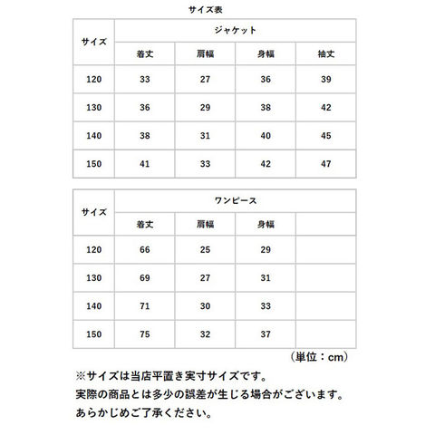| 重量 | 【ジャケット】約367g 【ワンピース】約220g (※130cmサイズの商品の重量です。) |