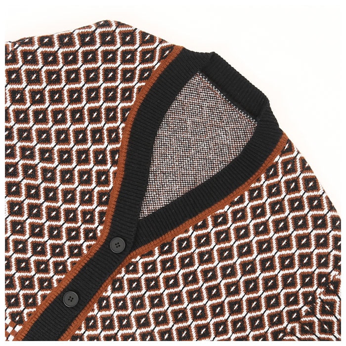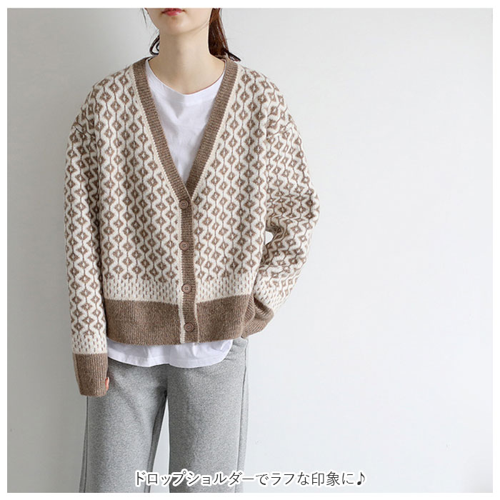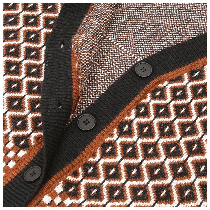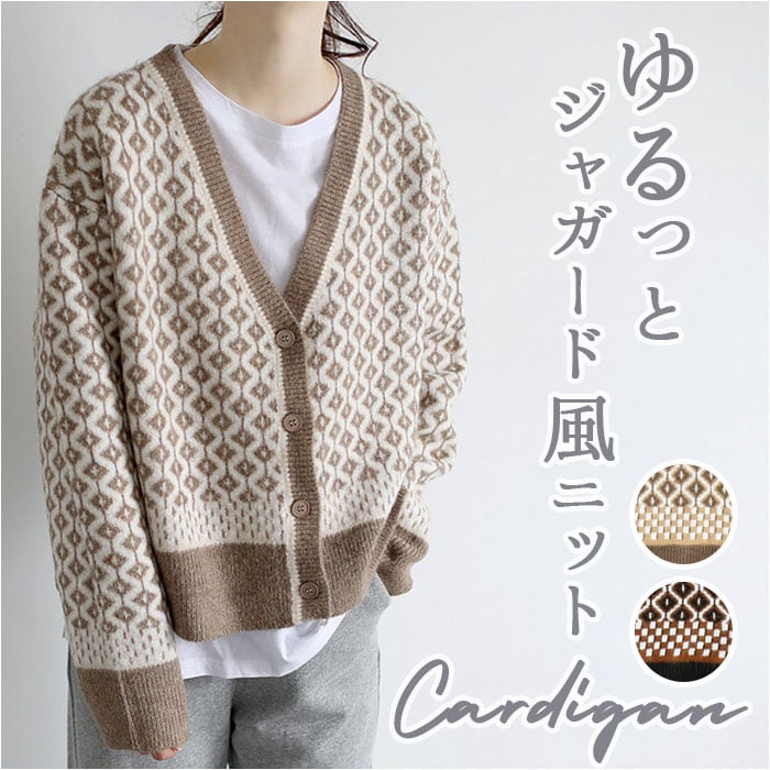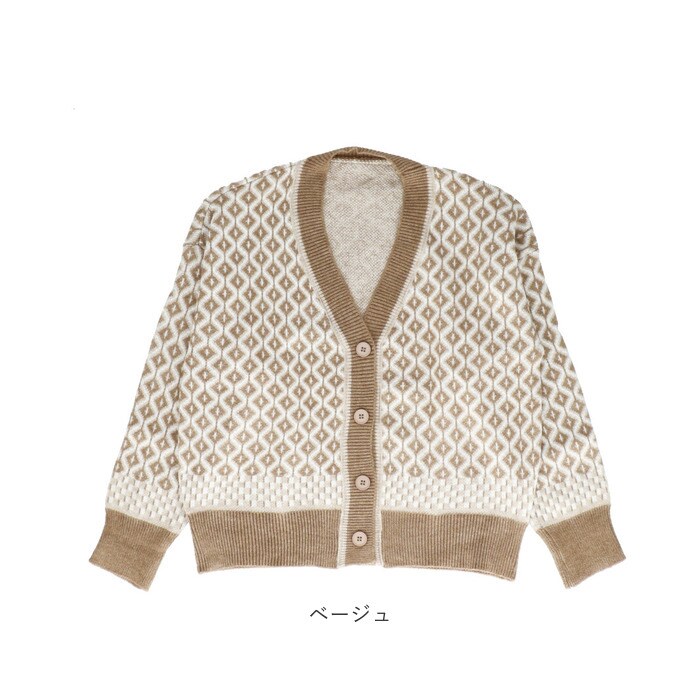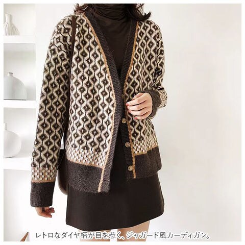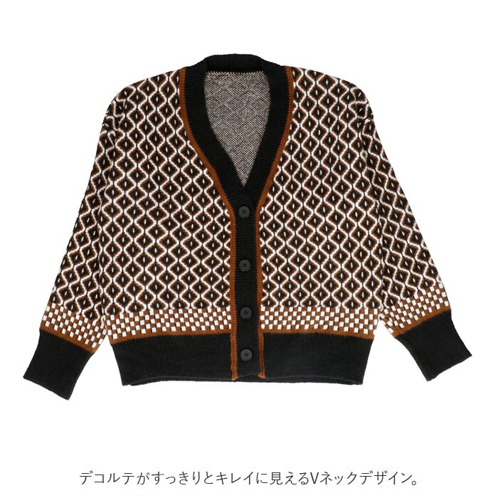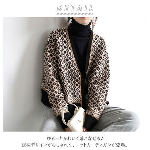 | 商品説明 | ゆるっとかわいく着こなせる♪総柄デザインがおしゃれな、ニットカーディガンが登場。レトロなダイヤ柄が目を惹く、ジャガード風カーディガン。デコルテがすっきりとキレイに見えるVネックデザイン。ドロップショルダーでラフな印象に♪カジュアルになりすぎないミディアム丈。柔らかくしっかりとした生地感で、あたたかいのもポイント。フロントボタンを開けても閉めてもOK。お好みやコーデに合わせて自由にスタイリング♪肌寒い季節にサッと羽織れる、着回し力抜群のアイテム。 |