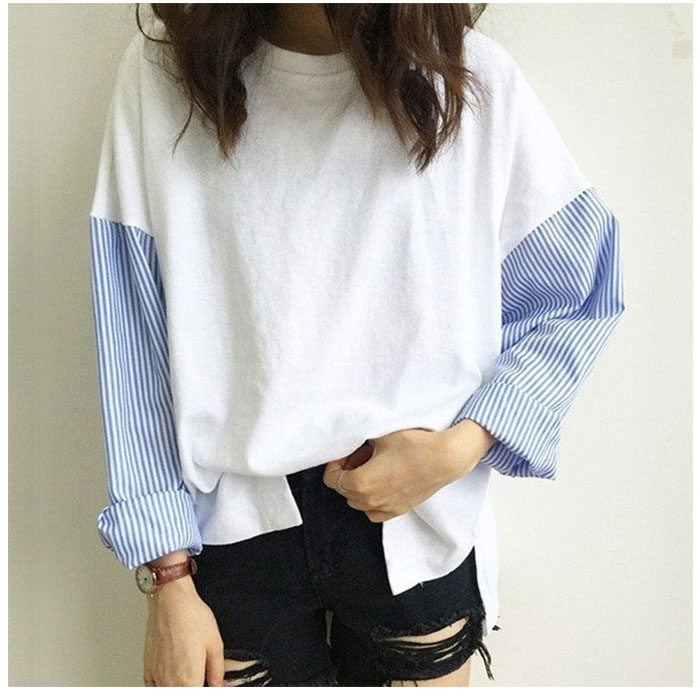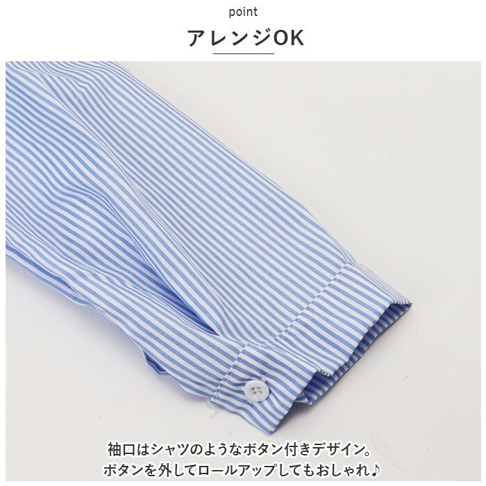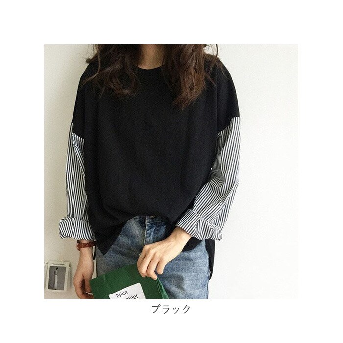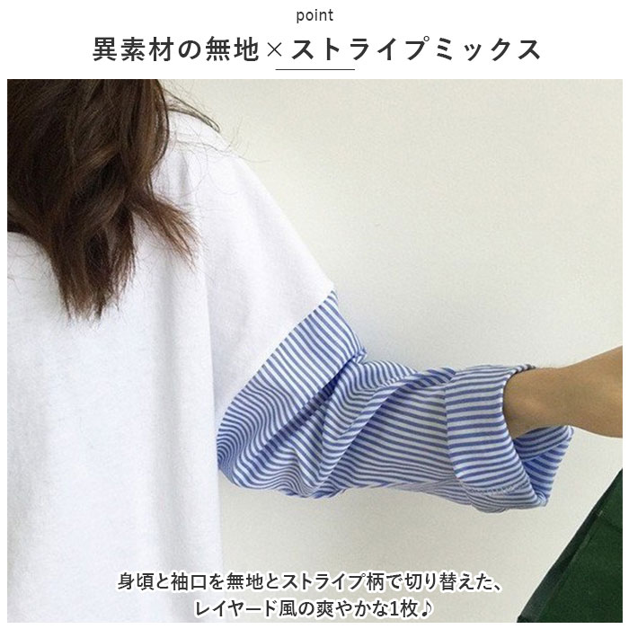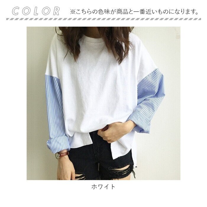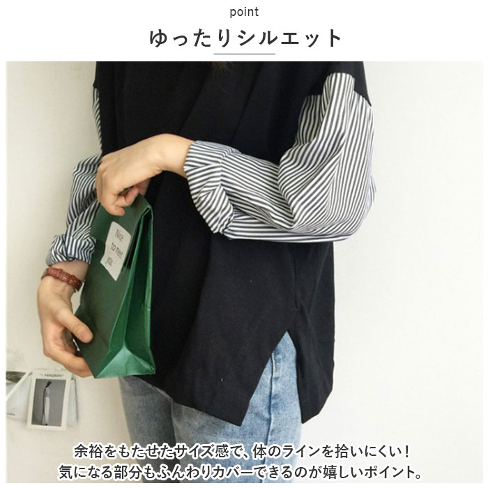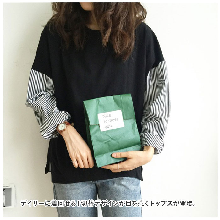 | 商品説明 | デイリーに着回せる!切替デザインが目を惹くトップスが登場。【異素材の無地×ストライプミックス】身頃と袖口を無地とストライプ柄で切り替えた、レイヤード風の爽やかな1枚♪【柔らかい肌触り】お肌に優しいコットン混紡素材を使った、薄手の生地感。【クルーネックタイプ】首元が詰まりすぎないクルーネック仕様。女性らしく優しげな印象に。【ゆったりシルエット】余裕をもたせたサイズ感で、体のラインを拾いにくい!気になる部分もふんわりカバーできるのが嬉しいポイント。【アレンジOK】袖口はシャツのようなボタン付きデザイン。ボタンを外してロールアップしてもおしゃれ♪【着回し力ばっちり】ボトムス次第でキレイめにもカジュアルにもキマる!大活躍間違いなしのアイテム。 |