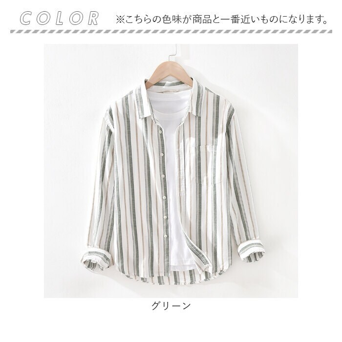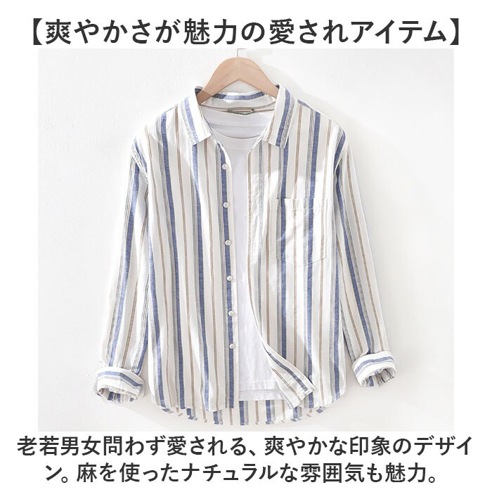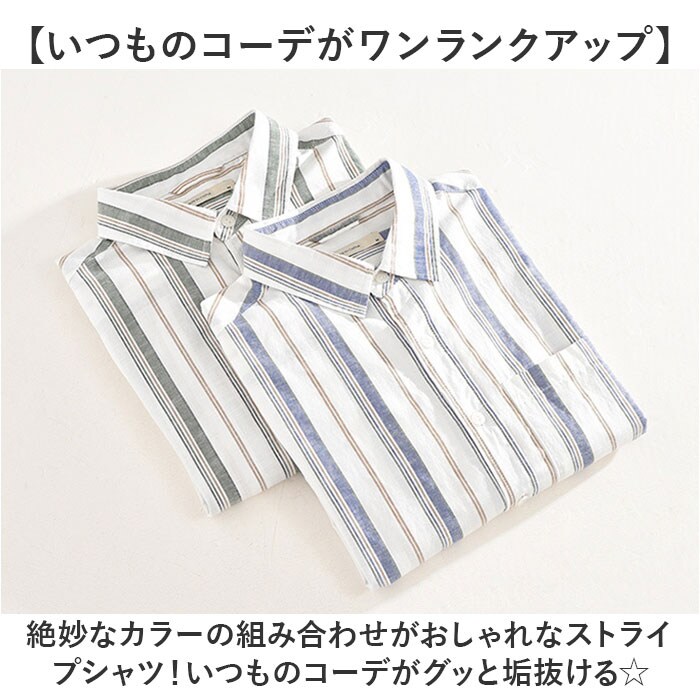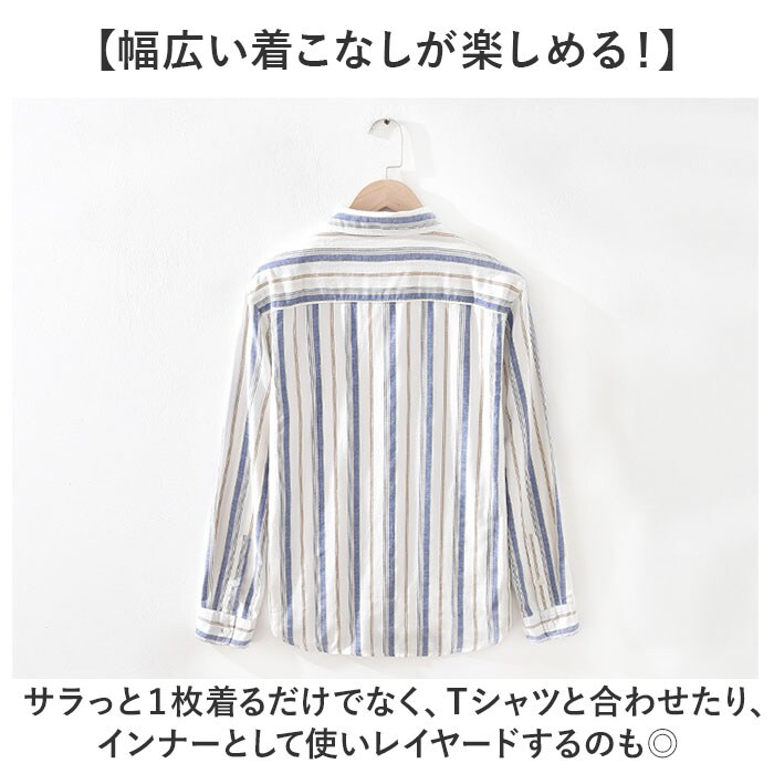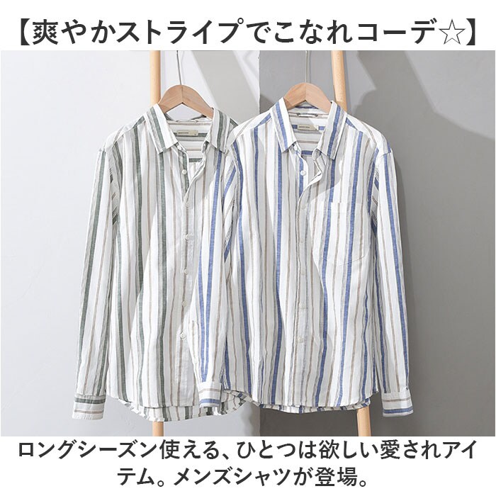 | 商品説明 | 【爽やかストライプでこなれコーデ☆】ロングシーズン使える、ひとつは欲しい愛されアイテム。メンズシャツが登場。【いつものコーデがワンランクアップ】絶妙なカラーの組み合わせがおしゃれなストライプシャツ!いつものコーデがグッと垢抜ける☆【爽やかさが魅力の愛されアイテム】老若男女問わず愛される、爽やかな印象のデザイン。麻を使ったナチュラルな雰囲気も魅力。【幅広い着こなしが楽しめる!】サラっと1枚着るだけでなく、Tシャツと合わせたり、インナーとして使いレイヤードするのも◎【ロングシーズン使える薄手の長袖】薄めの生地なので、季節の変わり目から冷房の冷えが気になる夏場、冬はニットと♪など年中OK。【リラックスムードもオフィスもOK】休日のリラックスムードなコーデはもちろん、オフィスカジュアルにも使える! |