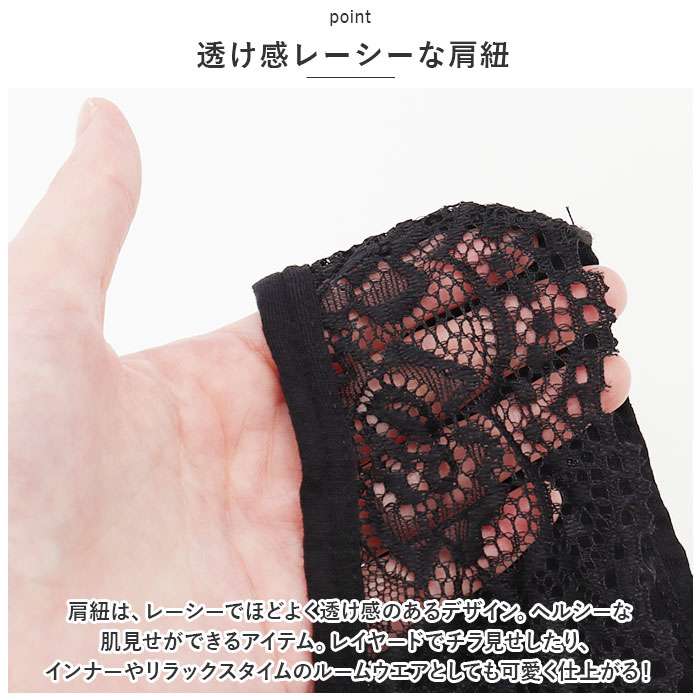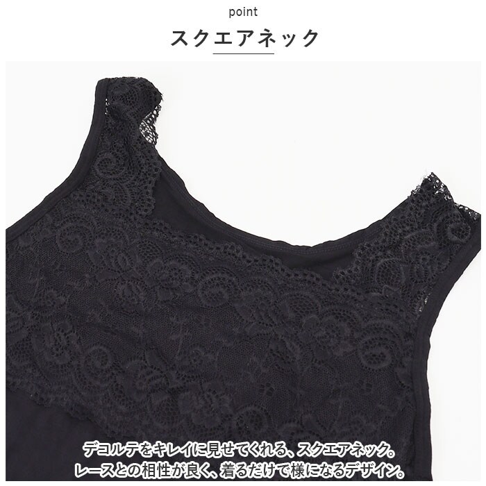 | 商品説明 | レース×透け感が今っぽい♪インナーにも重ね着にも使える タンクトップが登場。【レースデザイン】女性らしさを大切にした、レースデザインがオトナっぽさを演出。シンプルだけどこだわりのある作りで、デザイン性の高いアイテム。【透け感レーシーな肩紐】肩紐は、レーシーでほどよく透け感のあるデザイン。ヘルシーな肌見せができるアイテム。レイヤードでチラ見せしたり、インナーやリラックスタイムのルームウエアとしても可愛く仕上がる!【スクエアネック】デコルテをキレイに見せてくれる、スクエアネック。レースとの相性が良く、着るだけで様になるデザイン。【フィットする着心地】モダールとスパンデックスを使用した薄手の生地なので、伸縮性に優れ身体に優しくフィット。汗を吸収しサラっと気持ちいい、インナーに最適の着心地。【ベーシックカラー】インナーでも重ね着でも使いやすい、ベーシックカラーをご用意。毎日着るものだから、色違いでゲットするのもオススメ☆ |