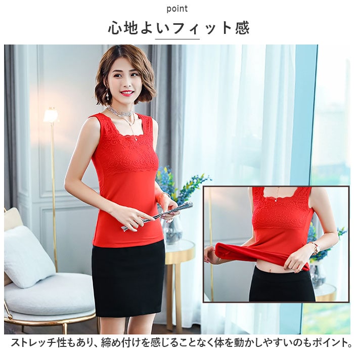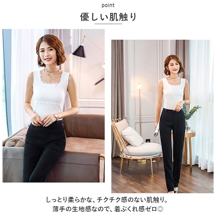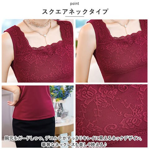 | 商品説明 | ストレスフリーな着心地♪使い勝手ばっちりな、タンクトップインナーが新登場。【優しい肌触り】しっとり柔らかな、チクチク感のない肌触り。薄手の生地感なので、着ぶくれ感ゼロ◎【心地よいフィット感】ストレッチ性もあり、締め付けを感じることなく体を動かしやすいのもポイント。【スクエアネックタイプ】胸元をガードしつつ、デコルテがすっきりキレイに見えるネックデザイン。華奢なネックレスも美しく映える♪【着回し力ばっちりなタンクトップ】透け感のあるトップスに忍ばせたり、上からシャツなどを羽織ってもOK。【上品な印象に】シンプルな無地カラーに、繊細なレースデザインをプラス。さりげなく大人感がアップ♪【選べるカラーバリエーション】ベーシックや差し色になるカラーをラインナップ。トップスに合わせたり洗い替え用に、色違いで揃えるのもおすすめ。 |