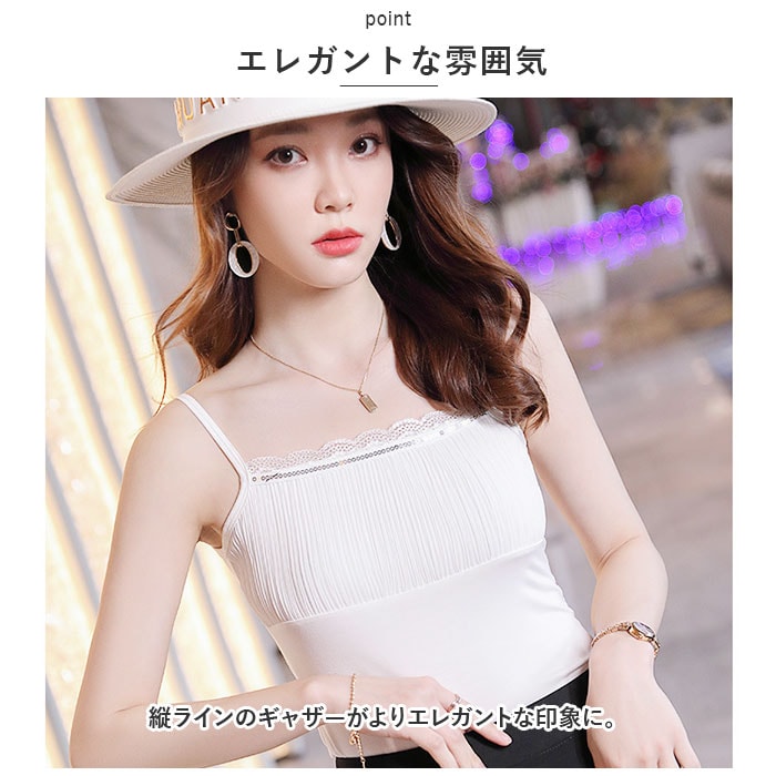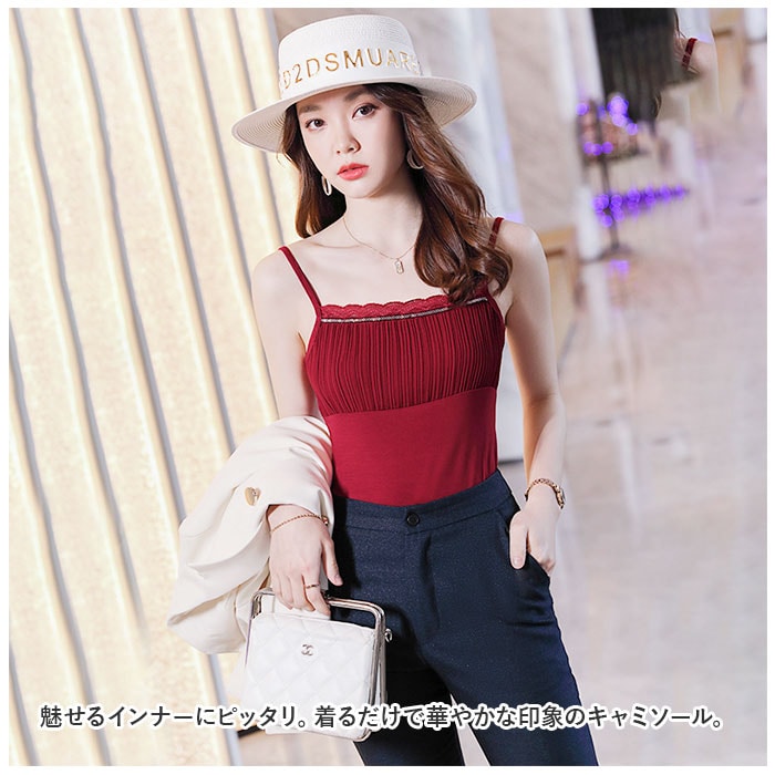 | 商品説明 | 魅せるインナーにピッタリ。着るだけで華やかな印象のキャミソール。【魅せるインナー】胸元にキラリと光るスパンコールと、女性らしさ際立つ上品なレースデザインがアクセント♪【エレガントな雰囲気】縦ラインのギャザーがよりエレガントな印象に。【ストレッチ性】サラッとした生地感。程よくストレッチ性があり、ボディラインに心地よくフィット。【心地よい着用感】素肌に触れても快適!滑らかな肌触りでオールシーズン活躍。【自分サイズにフィット】肩紐を自由に調節可能。お好みや身長に合わせて丈感を微調整◎【お手入れ簡単】自宅で手洗いできるから、お手入れラクラク。乾きが早いのも嬉しいポイント。【大人な仕上がり】どなたでも着用しやすいモノトーンカラーからアクセントカラーまで。ジャケットやブラウスのインナーに合わせるだけで大人な雰囲気に。【使い勝手抜群】高級感あるディテールなので、デイリーからフォーマルシーンまで使えるので1枚持っているととっても便利。 |