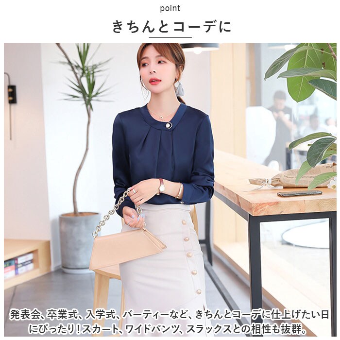 | 商品説明 | ニュアンスボタンでアクセサリーいらず☆サテン風の上品な ブラウス が登場。【アクセサリーいらず】首元と袖にニュアンスボタンをON。華やかなアクセントになり、アクセサリー無しでもバッチリおしゃれ&きちんと見え☆1枚サラっと着るだけでキレイめスタイルが完成。【サテン風の高見え生地】ほどよく光沢のあるツヤサラ生地はまるでサテン生地のよう。フォーマルやオフィス、お休みの日も、どんな日も上品でオトナな雰囲気にキマる♪【クラシカルな印象】ノーカラー襟と襟元のプリーツ、素材感、ニュアンスボタン、すべてがクラシカルな雰囲気。シンプルだけど、カタチで魅せるおしゃれさが魅力。【きちんとコーデに】発表会、卒業式、入学式、パーティーなど、きちんとコーデに仕上げたい日にぴったり!スカート、ワイドパンツ、スラックスとの相性も抜群。【選べるカラー】大人可愛いカラーのラインナップ。どの色も落ち着きがあるので合わせやすい。お好みのカラーをチョイス♪ |