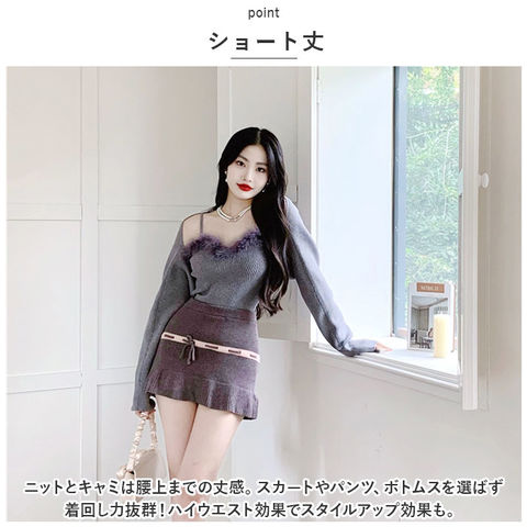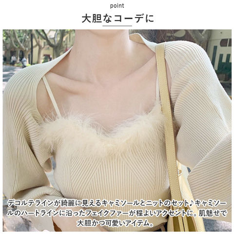 | 商品説明 | ふんわりファーとニットが秋っぽい♪トップスセットが新発売♪【大胆なコーデに】デコルテラインが綺麗に見えるキャミソールとニットのセット♪キャミソールのハートラインに沿ったフェイクファーが程よいアクセントに。肌魅せで大胆かつ可愛いアイテム。【ショート丈】ニットとキャミは腰上までの丈感。スカートやパンツ、ボトムスを選ばず着回し力抜群!ハイウエスト効果でスタイルアップ効果も。【単品使いも】セットで使うのはもちろん、単品で使うのもおススメ♪キャミソールはオールシーズン使える◎【幅広いコーデに】ボトムス次第でカジュアル、フェミニン、モード等様々なコーデに対応。秋のコーデをワンランクアップ♪ |