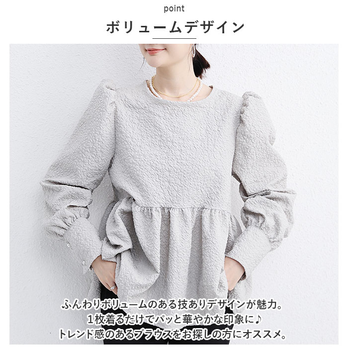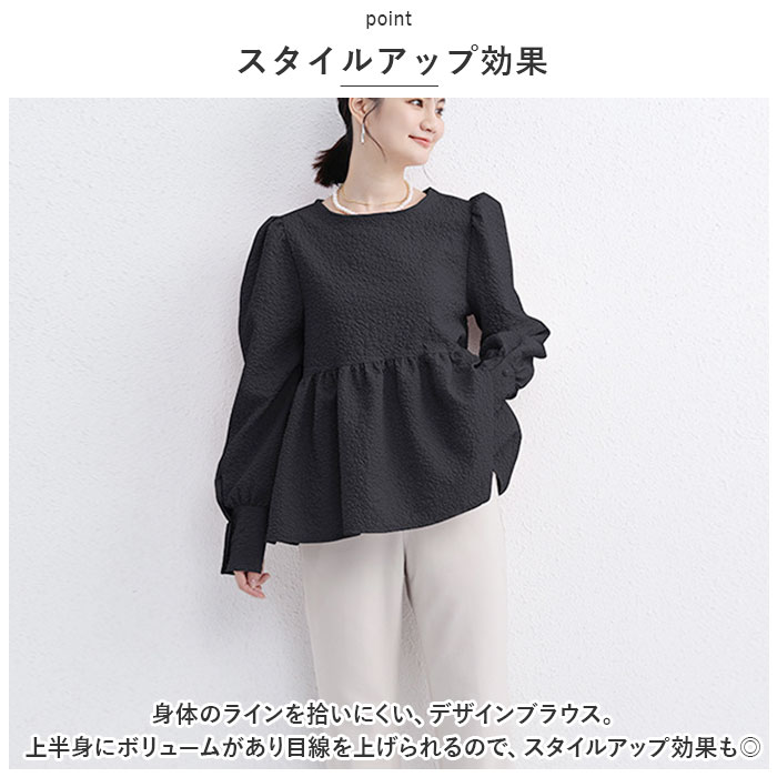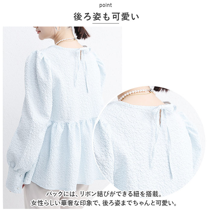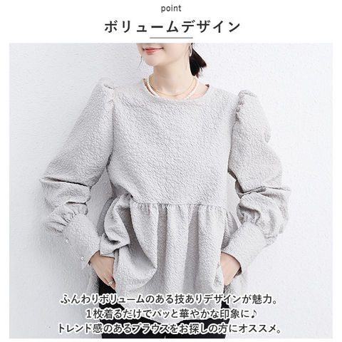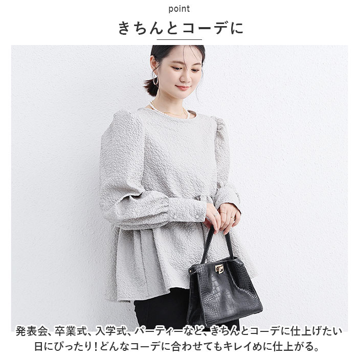 | 商品説明 | ペプラム&袖コンシャスの華やかな技ありデザイン♪ ブラウス 登場。【ボリュームデザイン】ふんわりボリュームのある技ありデザインが魅力。1枚着るだけでパッと華やかな印象に♪トレンド感のあるブラウスをお探しの方にオススメ。【ペプラムトップス】ウエスト部分で切替えのあるペプラムトップス。裾に向かってフレアに広がっているので、上品でオトナな雰囲気。シンプルだけど、カタチで魅せるおしゃれさ。【袖コンシャス】デザイン性の高い、パフスリーブ袖。袖口にはパールライクなアクセントをプラスし、まるでアクセサリーを付けているかのよう♪【後ろ姿も可愛い】バックには、リボン結びができる紐を搭載。女性らしい華奢な印象で、後ろ姿までちゃんと可愛い。【きちんとコーデに】発表会、卒業式、入学式、パーティーなど、きちんとコーデに仕上げたい日にぴったり!どんなコーデに合わせてもキレイめに仕上がる。【スタイルアップ効果】身体のラインを拾いにくい、デザインブラウス。上半身にボリュームがあり目線を上げられるので、スタイルアップ効果も◎【選べるカラー】大人可愛いカラーのラインナップ。どの色も落ち着きがあるので合わせやすい。お好みのカラーをチョイス♪ |