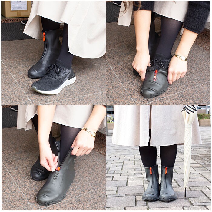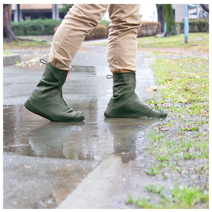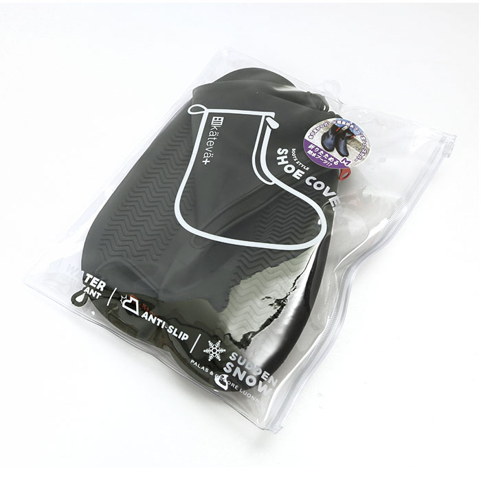 | 商品説明 | 雨や泥汚れから靴をガードする!「Kateva+(カテバプラス)軽量防水ブーツ型シューズカバー・Mサイズ」が登場。普段履いているシューズにかぶせるだけの簡単仕様。突然の雨や泥はねが気になる日にサッと履いてお出かけできる!素材にはシリコーンとゴムの複合材を使用することでグリップ力がアップ!濡れたマンホールやタイルの上でも滑りにくい。(※滑りを防止する商品ではないため、滑りやすい場所でのご使用には十分ご注意ください。)履き口から足の甲まで大きく開くファスナー開閉式。靴ごと足がスッと入り、ズボンの裾まですっぽりとINできるほど伸縮性に優れているため、足元の濡れをしっかり防ぐ!(※本製品は防雨用です。完全防水仕様ではありません。ファスナー部分より上の水位まで浸水すると水が内部に侵入します。)折りたたんで付属のスライダー式クリアポーチにコンパクトに収納可能。いつものバッグに入れておけば、急な雨に降られても安心。履き口にはプルストラップがついているので、使った後には吊るして乾燥させることができて便利。タウンユースはもちろん、お庭でのガーデニング作業からアウトドアまで、幅広いシチュエーションで大活躍。 |