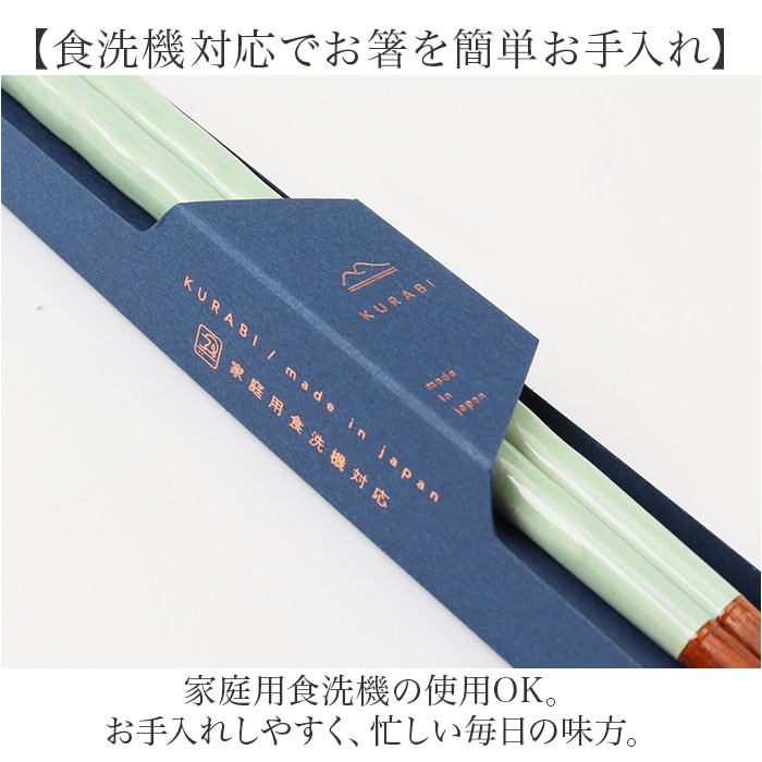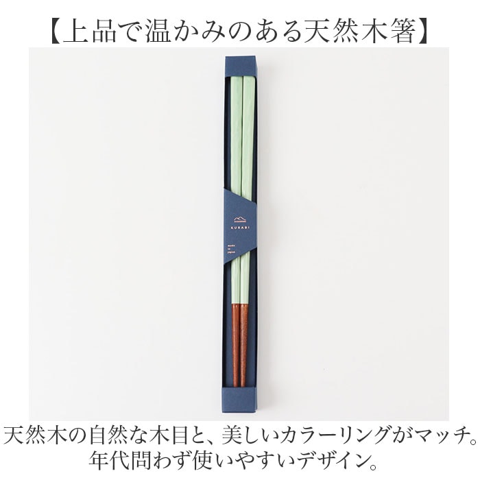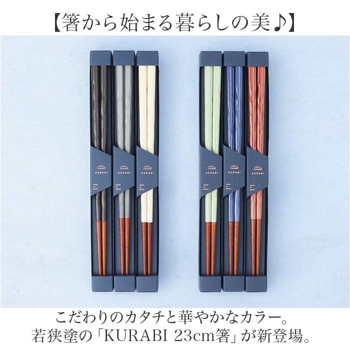 | 商品説明 | 【箸から始まる暮らしの美♪】こだわりのカタチと華やかなカラー。若狭塗の「KURABI 23cm箸」が新登場。【上品で温かみのある天然木箸】天然木の自然な木目と、美しいカラーリングがマッチ。年代問わず使いやすいデザイン。【独特の風合いを楽しめるのも魅力】上部に彫りを刻んで自然な凹凸を生み出し、手にフィット。窪みに色が溜まり、風合いも増す♪【食材をキャッチして食べやすい◎】箸先には、食材をつかみやすい滑り止め加工済み。箸先が丸く、食べやすいのもポイント。【傷を防げてデイリー使いに最適】素地に表面塗装を施すことで、傷つきをガード。毎日の食事のお供に最適。【食洗機対応でお箸を簡単お手入れ】家庭用食洗機の使用OK。お手入れしやすく、忙しい毎日の味方。【お気に入りを選べるカラー】滑らかなツヤ感や、マットな質感のカラー。安心の日本製で、家族や来客用に色違い揃えも。【新生活などのお祝いギフトに】・「幸せの橋渡し」の意味合いを持つお箸。福井の海を思わせるネイビーブルーの化粧箱入り♪【クラフトならではのKURABI】一膳、一膳、丁寧に。伝統技術の優しさはそのままに、手造りならではの質感・風合いを。 |