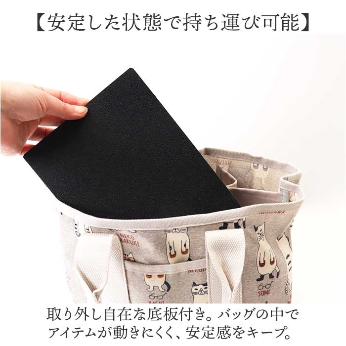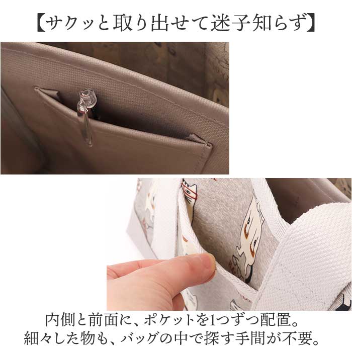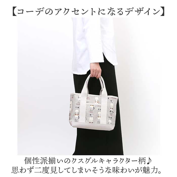 商品説明【すっきり整理整頓◎お出掛けの味方】簡単に仕分けできる、仕切り機能付き。「表側コーティング 仕切りトートバッグ」Sサイズ。【コーデのアクセントになるデザイン】個性派揃いのクスグルキャラクター柄♪思わず二度見してしまいそうな味わいが魅力。【シーンを気にせずお手入れも簡単】表面は汚れが付きにくく、水滴もサッと拭き取れるビニールコーティング加工済み。【ラクラク仕分けで収納上手に♪】内側を仕切りで分けて、3つのスペースに。中身がひと目で確認できるのが嬉しい!【仕切りをまたいで裏技アレンジ】仕切りは底まで縫製されていないので、お弁当箱などを収納することも可能。(※)収納物の厚みなどにより、収納できない場合もあります。【B5サイズ対応の大ルーム】B5サイズが横向きに。長財布なども収納でき、小物がざっくりまとまるサイズ感。【A5サイズ対応の中ルーム】A5サイズが縦向きに。ミニポーチやサニタリーグッズなど。色んな小物をINできる大きさ。【ペットボトルが収納できる小ルーム】・500mlペットボトルや折りたたみ傘を縦向きに収納。倒れる心配もなく安心。【サクッと取り出せて迷子知らず】内側と前面に、ポケットを1つずつ配置。細々した物も、バッグの中で探す手間が不要。【いつでもどこでもスムーズに開閉】ひと手間をなくしたオープン開口。ガバっと開いて、移動中もスマートに取り出し。【安定した状態で持ち運び可能】取り外し自在な底板付き。バッグの中でアイテムが動きにくく、安定感をキープ。【使い心地軽やかでストレスフリー】サッと持ち出せる軽量設計。移動中も体にかかる負担を軽減できるのが嬉しい!【選ぶのも楽しいバリエーション】お気に入りを見つけて、一緒にお出掛け☆人と被りにくく、ちょっとしたギフトにも。【ポケット仕様】内側:オープンポケット×1前面:オープンポケット×1