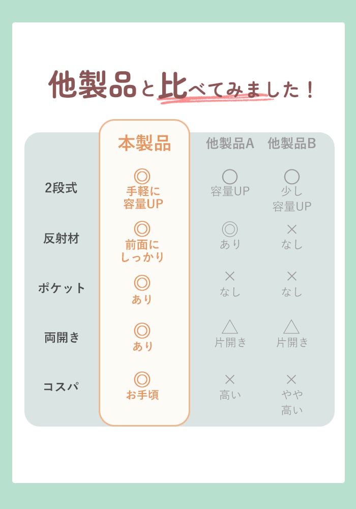 | 商品説明 | 2段式収納で、荷物が無いときはスッキリと、多いときはタップリと収納できます。ファスナーを開くと2段式になり、容量アップ!荷物が出し入れしやすいファスナー手前タイプ。水をはじきやすい撥水加工済。大切な荷物を雨や盗難から守ります。夜道も安全な反射帯付き。 |
