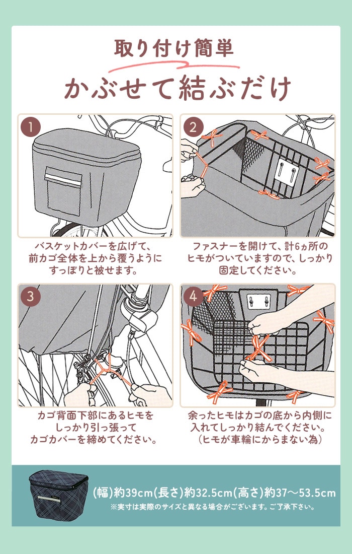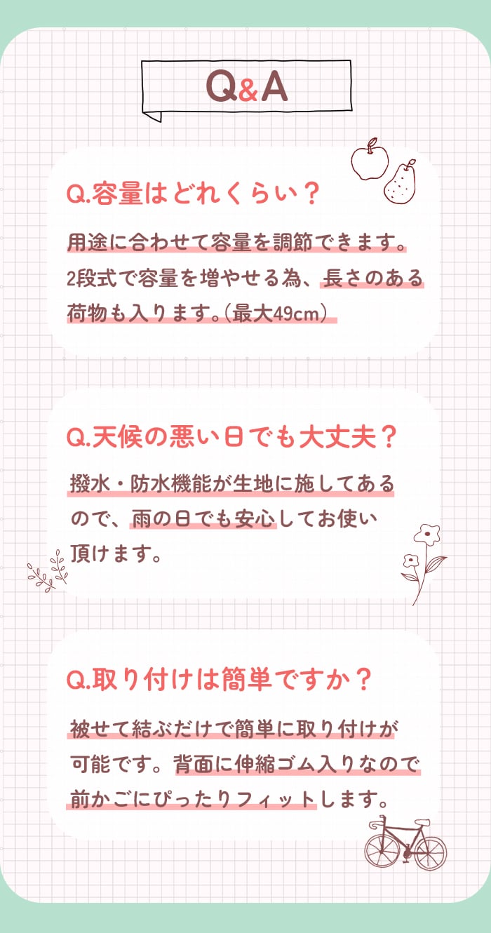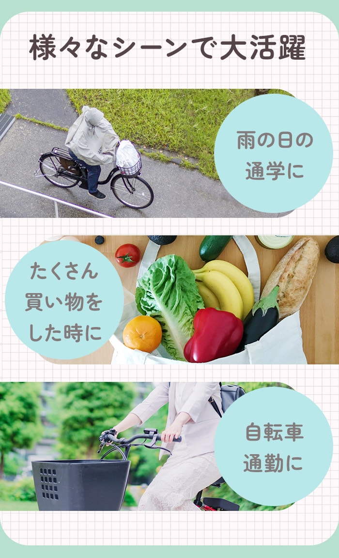 | 注意点 | ※車輪に紐が絡まるのを防ぐため、余った紐はカゴの底から内側に入れてしっかりと結んでください。 ※カメラやモニターの性質により、画像と実物の色の違いがある場合がございますのでご理解願います。 |