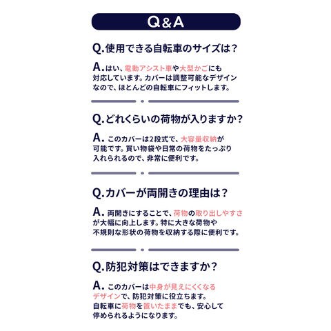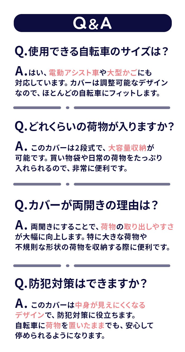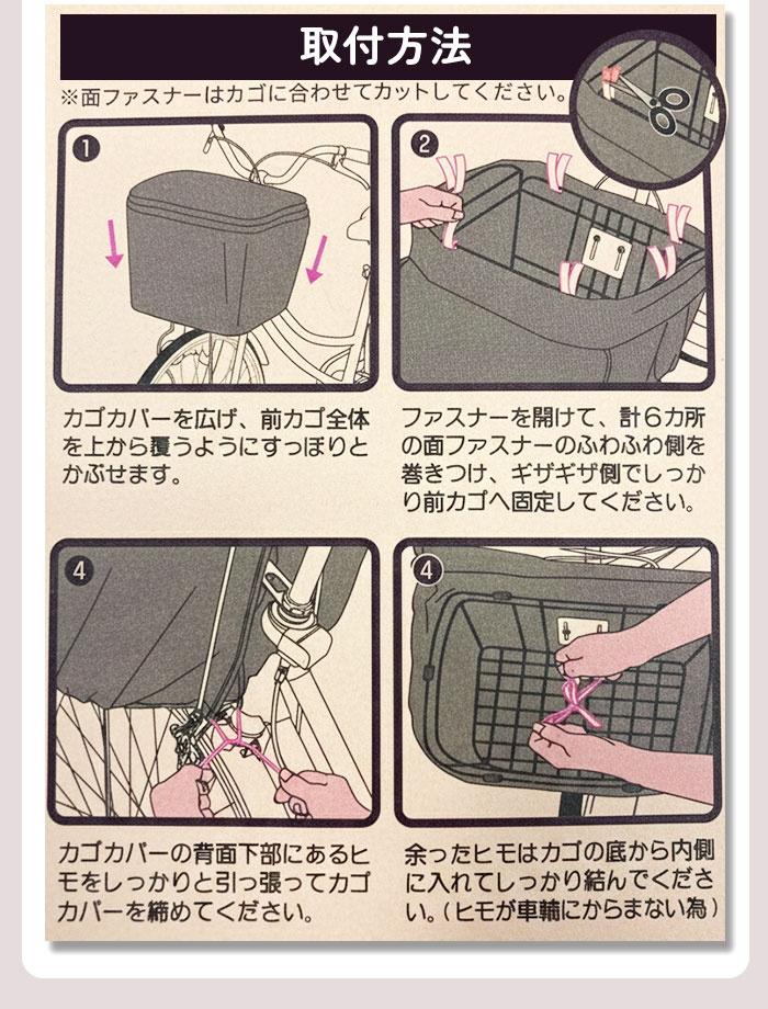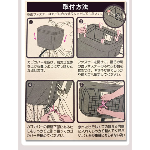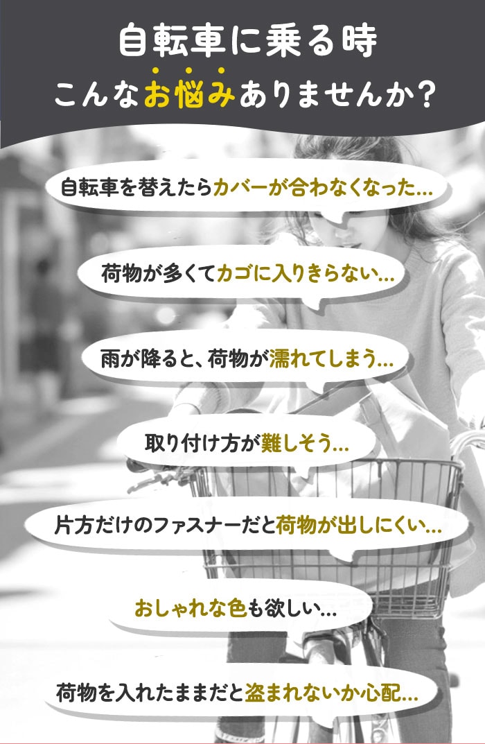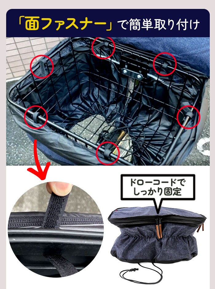 | 注意点 | 細かいメッシュカゴには使用できません。汚れは水またはぬるま湯で洗い流してください。もみ洗い等は避けてください。洗剤のご使用はおやめください。火気の近くでのご使用はおやめください。鋭利なもので突いたりひっかいたりしないでください。本製品は完全防水ではありません。サイズより大きなカゴに無理矢理かぶせないでください。破れる可能性があります。ひったくり防止や抑止には効果がありますが、安全ではありませんので、貴重品などの管理はご自身にて行ってください。使用上の損失については補償できません。用途以外にはご使用にならないでください。自然光などにより、若干の変退色が起こる可能性があります。デザイン、仕様等は予告なく変更、改良する場合がございます。カメラやモニターの性質により、画像と実物の色の違いがある場合がございますのでご理解願います。 |
