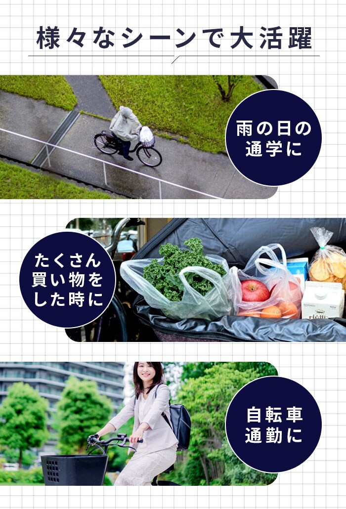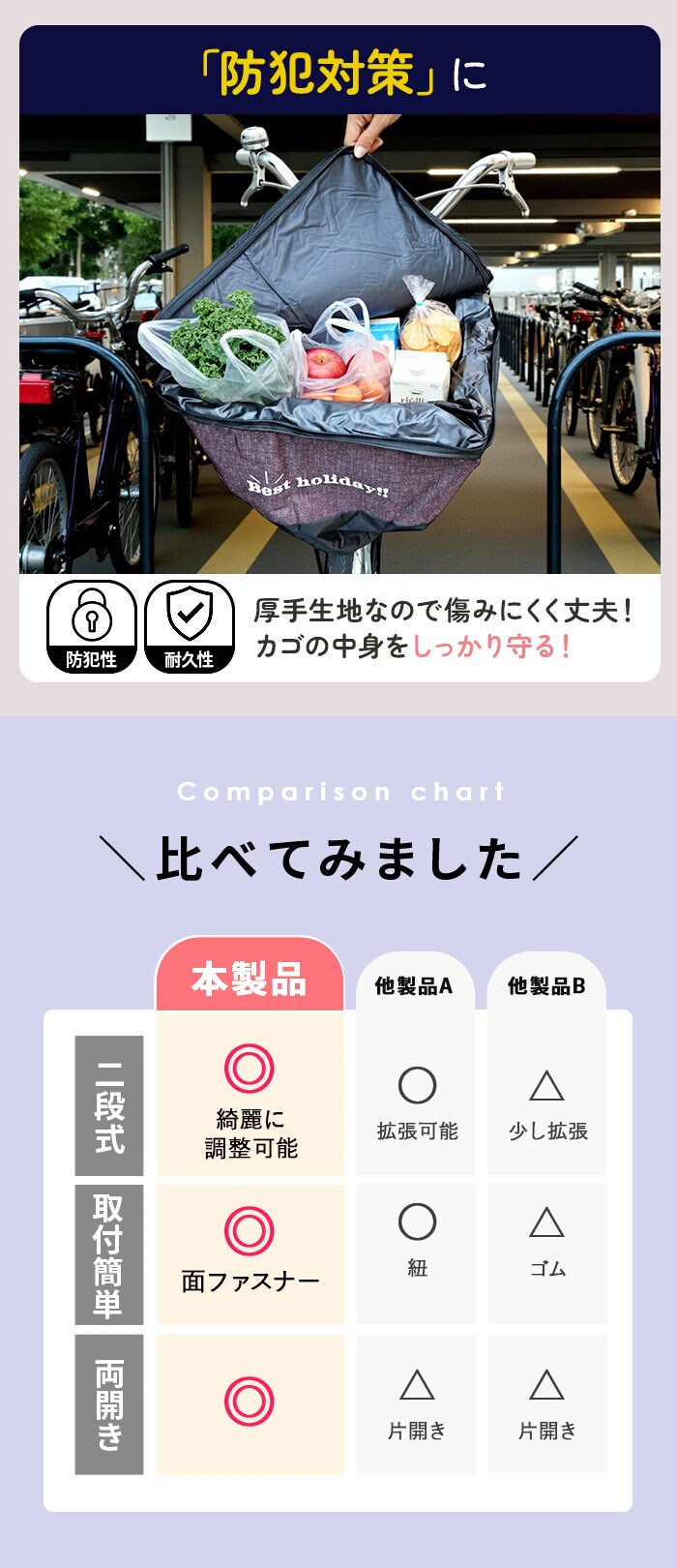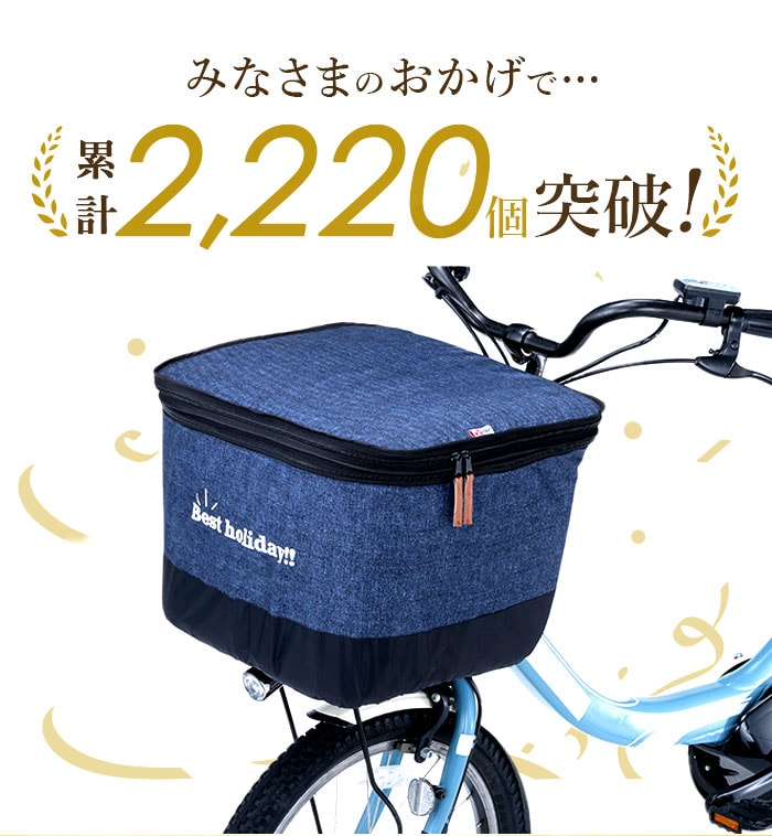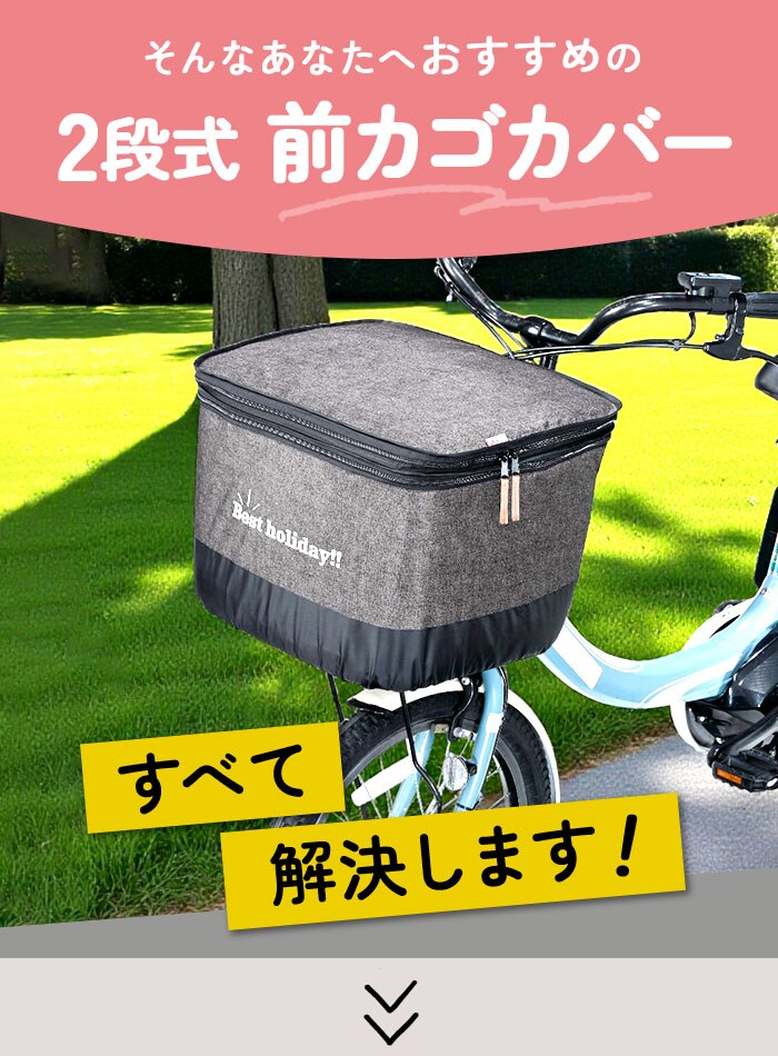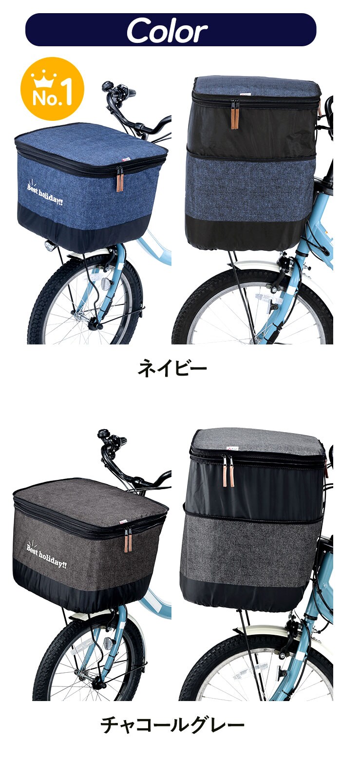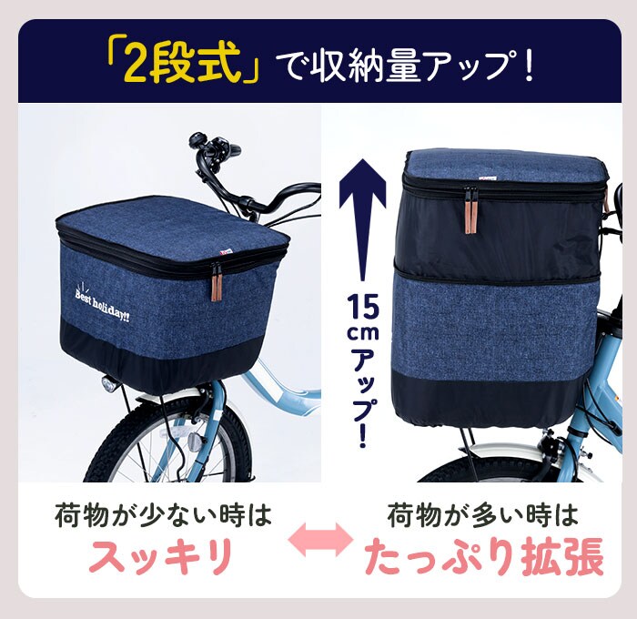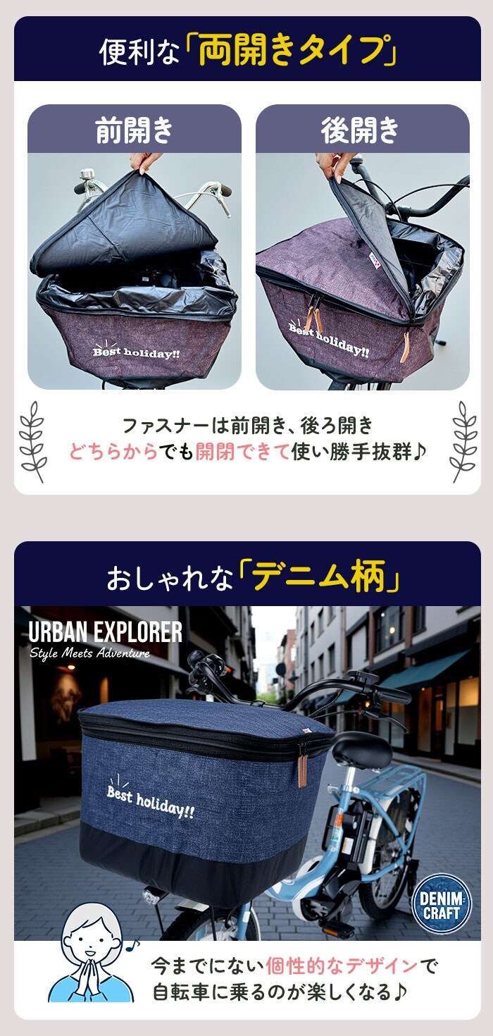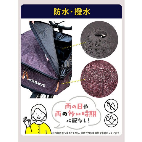 | 商品説明 | 自転車での通勤時や、お子様の送り迎えの時にも大活躍!大切な荷物を雨やひったくりから守る、自転車用2段式デニム調前カゴカバー。荷物が少ないときはすっきり!多いときにはたっぷり収納!その日の荷物の量に合わせてファスナーを開放し、2段式に容量アップ。電動アシスト車など、大型の前カゴにも対応するワイドサイズ。(※カゴ対応サイズ・・・横幅:約40cm×奥行:約32.5cm×高さ:約30cmの前カゴに装着可能。細かいメッシュタイプのカゴには取り付けできません。)カバー背面のゴムと、裾のドローコードで、カゴにしっかりとフィット。スタイリッシュなデニム調生地には、水滴をしっかり弾く厚手のはっ水加工生地を採用。突然雨に降られた時も荷物が雨に濡れるのを防ぎ、帰宅後にタオルでサッと拭くだけでお手入れも簡単!カバーの開口部はダブルファスナーでしっかりと閉じることができるので、ひったくり防止にも役立つ!(※ひったり抑止には効果がありますが、防犯上絶対ではありません。貴重品の管理はお客様ご自身で行ってください。)ファスナーは前開き・後ろ開き、どちらからでも開閉できる両開きタイプで使い勝手も抜群。フロントの「Best Holiday!!」のロゴがデザインのワンポイント!晴れの日も雨の日も、自転車でのお出掛けが快適! |