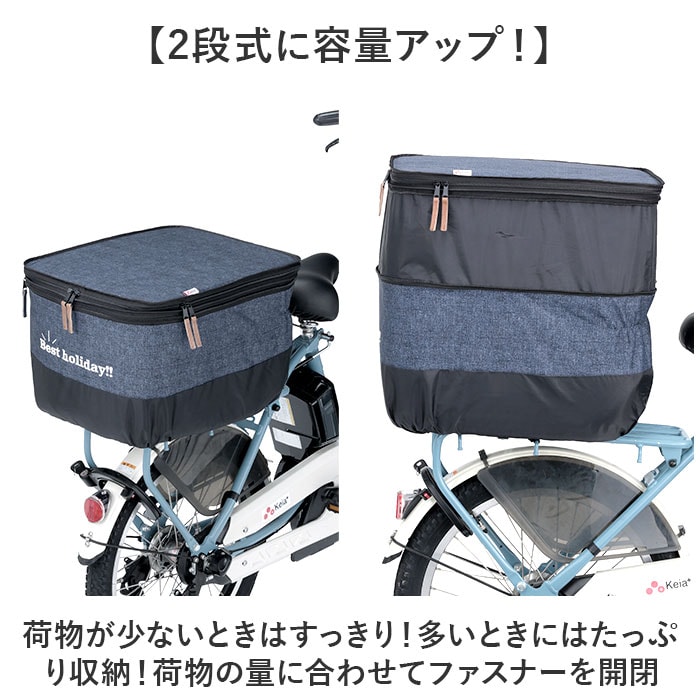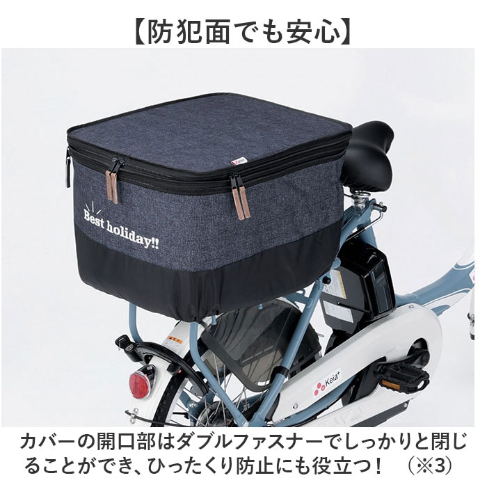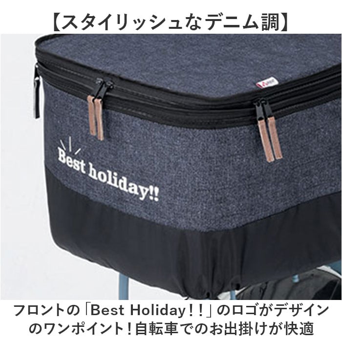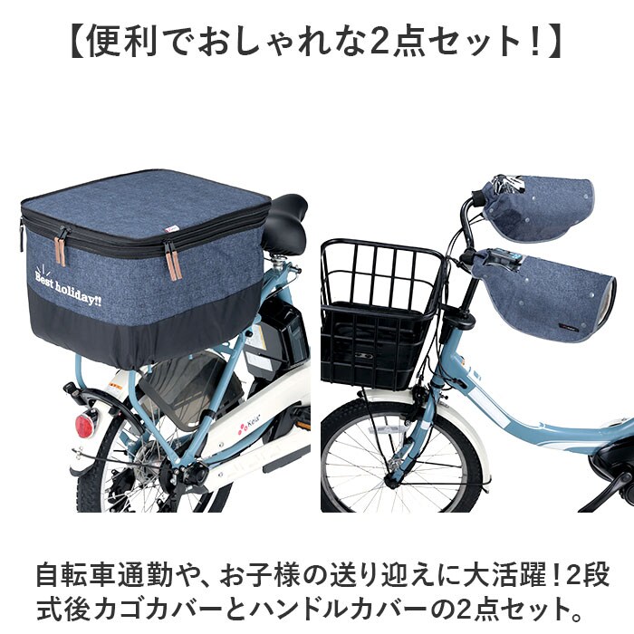 | 商品説明 | 【便利でおしゃれな2点セット!】自転車通勤や、お子様の送り迎えに大活躍!2段式後カゴカバーとハンドルカバーの2点セット。《2段式後カゴカバー》【2段式に容量アップ!】荷物が少ないときはすっきり!多いときにはたっぷり収納!荷物の量に合わせてファスナーを開閉【いろいろな大きのカゴに対応】普通サイズの自転車はもちろん、電動アシスト車などの後カゴにも対応するサイズ。(※1)カゴ対応サイズ・・・横幅:約33cm×奥行:約43.5cm×高さ:約26cmの後ろカゴに装着可能。細かいメッシュタイプのカゴには取り付けできません。【使用中もズレにくい安全設計】カバー背面のゴムと、裾のドローコードで、カゴにしっかりとフィット。(※2)装着時、ゴムの位置は自転車のサドル側になります。【お手入れのしやすさも◎】スタイリッシュなデニム調生地には、水滴をしっかり弾く厚手のはっ水加工生地を採用。【防犯面でも安心】カバーの開口部はダブルファスナーでしっかりと閉じることができ、ひったくり防止にも役立つ!(※3)ひったくり抑止には効果がありますが、防犯上絶対ではありません。貴重品の管理はお客様ご自身で行ってください。【荷物が出しやすい両開きタイプ】ファスナーは前開き・後ろ開き、どちらからでも開閉できる両開きタイプで使い勝手も抜群。【スタイリッシュなデニム調】フロントの「Best Holiday!!」のロゴがデザインのワンポイント!自転車でのお出掛けが快適《ハンドルカバー》【あったかインナーボア仕上げ】カバーの内側は、アルミ蒸着仕様のインナーボア付き。指先の冷えが気になる季節に大活躍!【着脱もラクラク】インナーはスナップボタンで着脱可能。紫外線の気になる季節は日焼け防止対策としても◎【手元が見やすい透明窓付き】電動アシスト車のバッテリー残量や変速レバーがひと目で確認できる透明窓付き。【反射材付きで視認性UP】カバーの縁には反射材が付いて雨の日や暗い夜道も安全に走行可能。 |