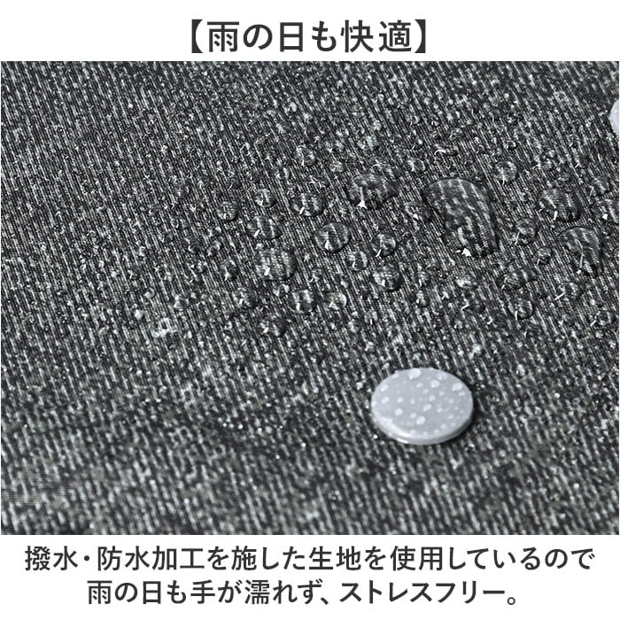 | 注意点 | 【雨の日も快適】撥水・防水加工を施した生地を使用しているので雨の日も手が濡れず、ストレスフリー。【スタイリッシュなデニム調】シンプルなデザインと落ち着きのあるカラー。男女問わず使いやすいのも嬉しいポイント。お取り扱いの際は、商品やパッケージなどに記載されている品質表示、アテンションタグ、ご使用上の注意事項などを必ずご確認下さい。本来の目的以外にはご使用にならないで下さい。カメラやモニターの性質により、画像と実物の色の違いがある場合がございますのでご理解願います。 |