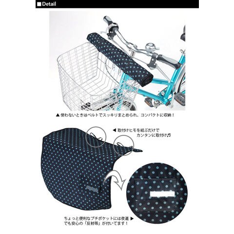 | 商品説明 | 取付け簡単なプチサイクルエプロンです。 雨や盗難から大切なカゴの荷物を守ります!! 使わない時は、本体を丸めてコンパクトに収納できるので、カゴ周りもスッキリ♪ ちょっと便利なプチポケットや反射帯も付いています♪ |