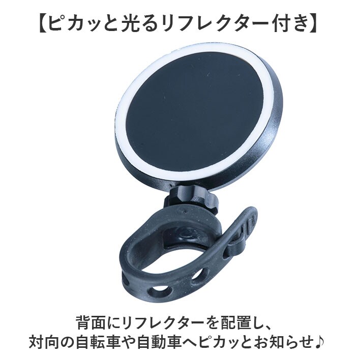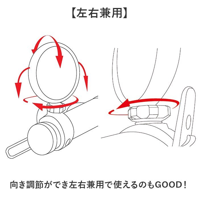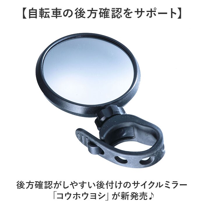 | 商品説明 | 【自転車の後方確認をサポート】後方確認がしやすい後付けのサイクルミラー「コウホウヨシ」が新発売♪【ほとんどの自転車に対応】一般的なシティサイクルはもちろん、電動アシスト自転車・マウンテンバイクにも対応。※【凸面鏡で見やすい】平面の鏡よりも奥行きと視野を広範囲に映し出せる凸面鏡を採用。【工具いらずで簡単設置】ハンドルにバンドを巻き付けるだけで設置完了♪グリップエンドにつけるのもOK。【サイズ調節可能】・4つの穴がベルトに開けられており、自転車のハンドルに合わせてサイズ調節が可能。【左右兼用】向き調節ができ左右兼用で使えるのもGOOD!【ピカッと光るリフレクター付き】背面にリフレクターを配置し、対向の自転車や自動車へピカッとお知らせ♪【注意点】※適応ハンドルサイズ 直径約22.2mm~約31.8mmまで |