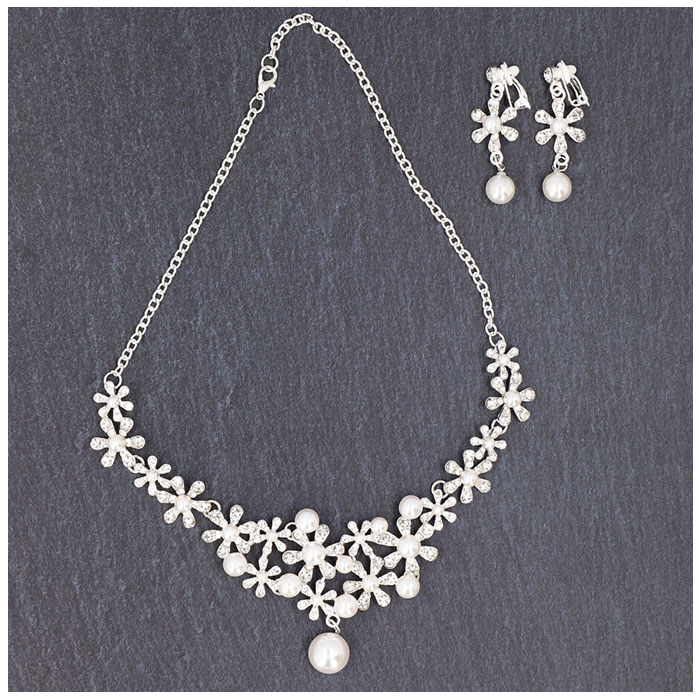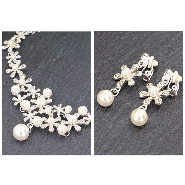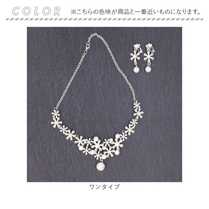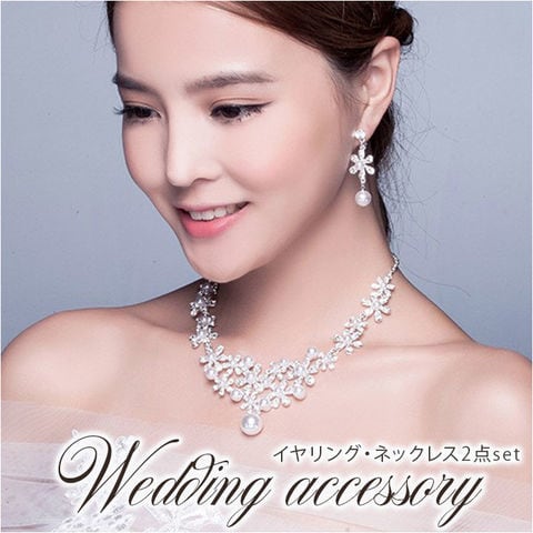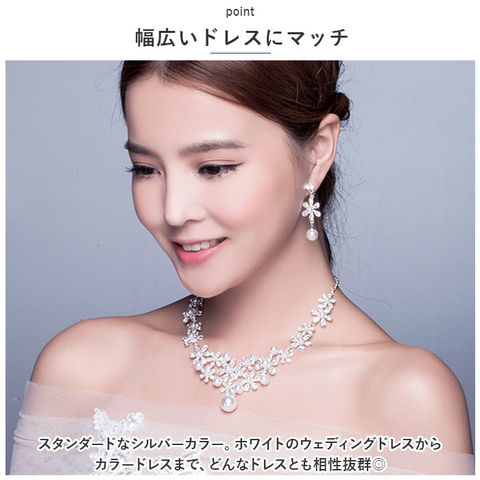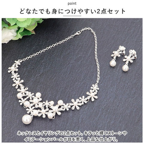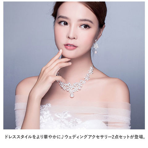 商品説明ドレススタイルをより華やかに♪ウェディングアクセサリー2点セットが登場。【どなたでも身につけやすい2点セット】ネックレスとイヤリングの2点セット。キラッと輝くストーンやイミテーションパールが目を惹く、上品な仕上がり。【着脱ラクラク】ネックレスは輪っかを留め具に通し、イヤリングは耳に挟むだけ。ピアスの穴が開いていない方にもおすすめ。【幅広いドレスにマッチ】スタンダードなシルバーカラー。ホワイトのウェディングドレスからカラードレスまで、どんなドレスとも相性抜群◎