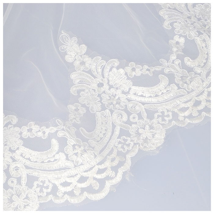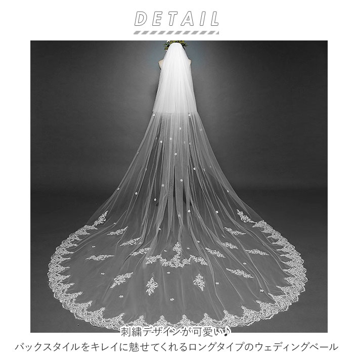 | 商品説明 | 刺繍デザインが可愛い♪ロングタイプのウェディングベール。肌触りの良い、柔らかなチュール生地を使用。バックスタイルをキレイに魅せてくれるロングタイプ。着脱カンタンなコーム付き。派手になりすぎない上品なデザインで、ドレスの美しさを引き立たせてくれる♪ |