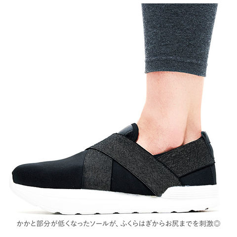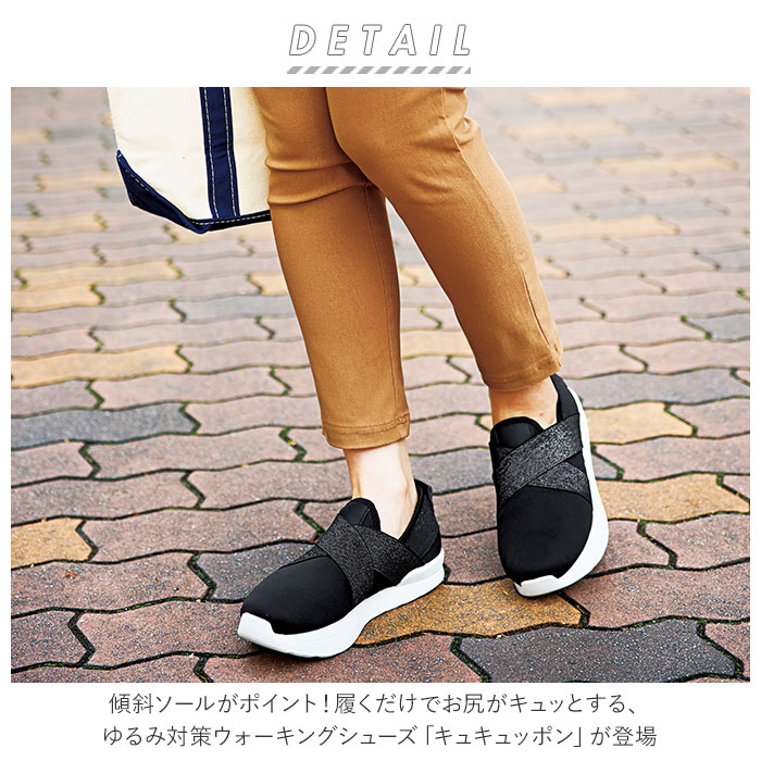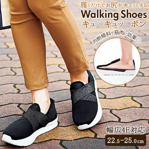 | 商品説明 | 傾斜ソールがポイント!履くだけでお尻がキュッとする、ゆるみ対策ウォーキングシューズ「キュキュッポン」が登場。かかと部分が低くなったソールが、ふくらはぎからお尻までを刺激◎また内側傾斜により、骨盤周りの筋肉や気になる内ももの内転筋にも効果が!アッパー部分は足にフィットするクロスゴム設計で、着脱もラクチン。かかとのカップでしっかりホールドされるから、歩きやすい♪幅広4E対応で、ゆったりと締め付け感なく履ける。毎日のウォーキングやお買い物、ガーデニング作業時など、毎日の生活の中で気軽にトレーニングが出来ちゃう♪ |