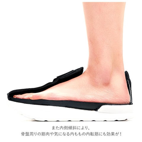 | 注意点 | ソール部分が特殊形状のため、歩きづらい場合があります。慣れるまではゆっくりと慎重に歩いてください。転倒の恐れがありますので、階段や斜面など不安定な場所や滑りやすい場所では使用しないでください。使用中に走ったり、飛び跳ねたりしないでください。また重たいものを持っての使用は、バランスを崩しやすいので絶対にしないでください。体調の優れない時や、足腰の調子が悪い時は使用しないでください。使用中、使用後に気分が悪くなったり、身体に異常があらわれた場合は直ちにご使用をおやめください。開封の際に臭いが気になる場合は、日陰で風に十分さらしてからご使用ください。インソールは取り外しでき、汚れたら水洗いできます。本品は洗濯できません。汚れが生じた場合は、乾いた布などで拭き取ってください。火気に近づけないでください。乾燥させる時は、風通しのよい場所で陰干ししてください。箱などに入れて長期保管する際は片足ずつ薄紙などで包んで収納してください。変色、変形、収縮など劣化の原因になりますので、直射日光や高温になる恐れのある場所には放置せず、日陰で保管してください。本来の用途以外には使用しないでください。使用感には個人差があります。カメラやモニターの性質により、画像と実物の色の違いがある場合がございますのでご理解願います。 |